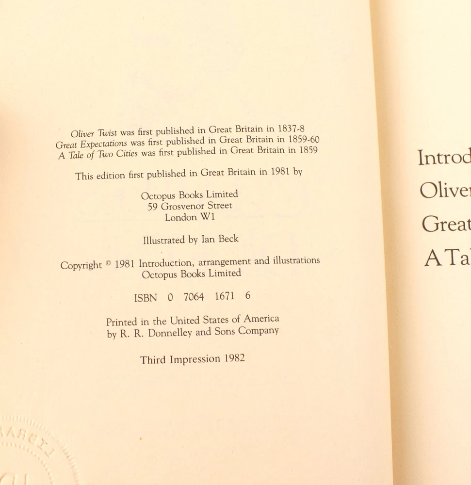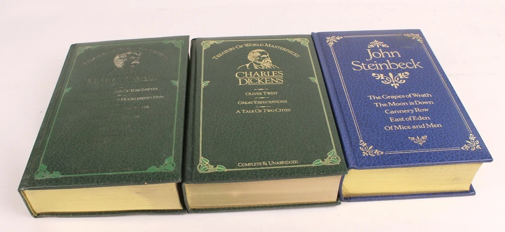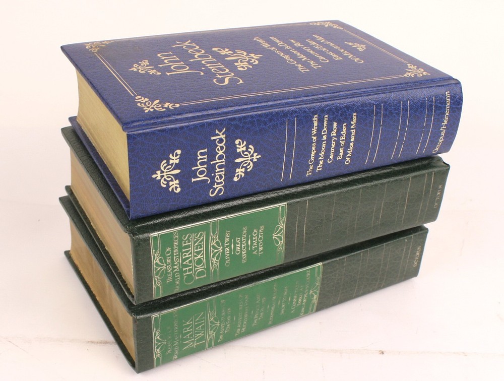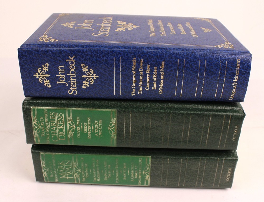 Octopus Book Lot of 3- Charles Dickens Complete & Unabridged--Octopus Mark Twain Complete & Unabridged--Octopus John Steinbeck--Octopus/Heinemann Overall Nice Condition but with some issues. The Mark Twain Lettering is very faded on the Cover. The Pages in the Twain and Dickens Books are yellowed and the Books show slight Shelf Wear. The Steinbeck is the best of the Bunch. Crisp White Pages and very Nice Cover. All 3 Books have an Embossed Personal Library Stamp. Check Photos Closely! (WT1--10-10-10--10.0)