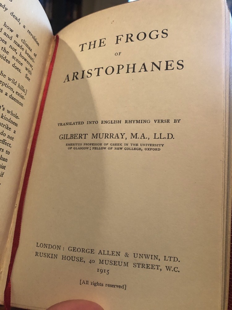 Two books finely bound, actually rebound, together with full morocco binding, gilt-edged pages, raised bands, with titles and translator's name gold embossed on spine. Oedipus King of Thebes by Sophocles, translated by Gilbert Murray, published by George Allen & Company, Ltd., London, 1912 The Frogs by Aristophanes, translated by Gilbert Murray, published by George Allen & Unwin, Ltd., London 1915 George Gilbert Aimé Murray OM FBA (2 January 1866 – 20 May 1957) was an Australian-born British classical scholar and public intellectual, with connections in many spheres. He was an outstanding scholar of the language and culture of Ancient Greece, perhaps the leading authority in the first half of the twentieth century. He is the basis for the character of Adolphus Cusins in his friend George Bernard Shaw's play "Major Barbara," and also appears as the chorus figure in Tony Harrison's play "Fram." He served as President of the Ethical Union (now Humanists UK) from 1929 to 1930 and was a delegate at the inaugural World Humanist Congress in 1952 which established Humanists International. He was a leader of the League of Nations Society and the League of Nations Union, which promoted the League of Nations in Britain. Murray died in Oxford in 1957, aged 91. His ashes were interred in Poets' Corner, Westminster Abbey.