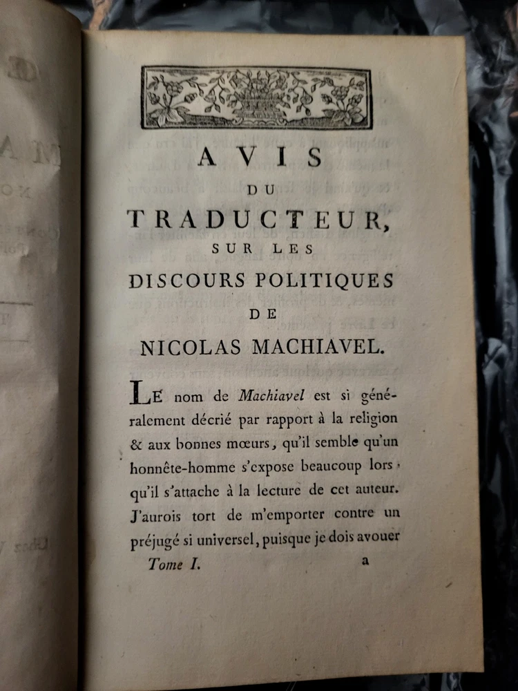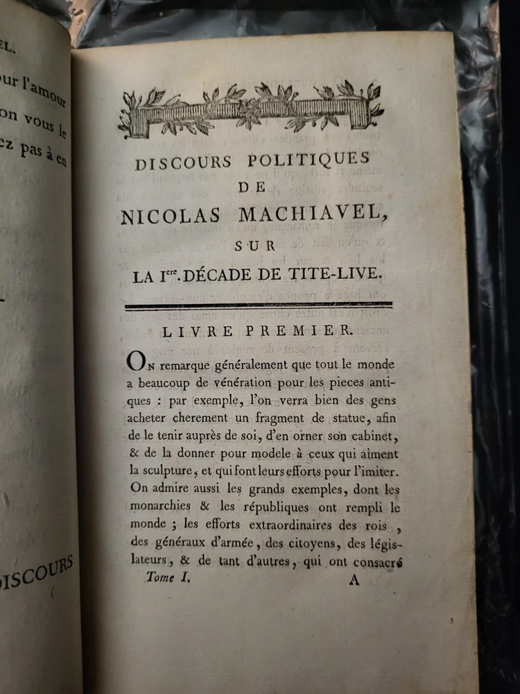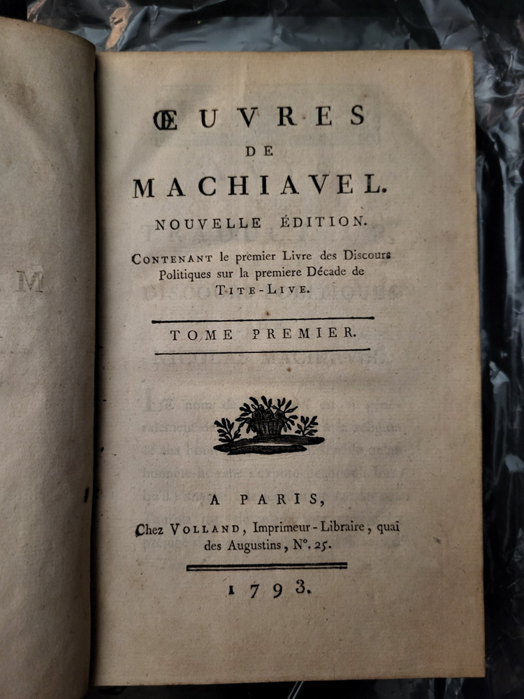Oeuvres De Machiavel Nouvelle Edition Tome Premier 1793 Chez Volland Paris, France Leather bound volume in good condition clean straight and tight with crisp white pages. Marble endpapers and outer page edges. Rubbing to corners and edges, some splitting at spine edges yet holding solid and tight. Amazingly, no foxing or broken hinges. We have been Booksellers for over 20 years. Please message us with any questions you may have about this awesome book! We will respond as swiftly as possible. We will combine shipping on auctions ending within 7 days of each other. Please communicate with us about when you would like your orders combined. All books are carefully packaged and shipped Media Mail in a sturdy box.