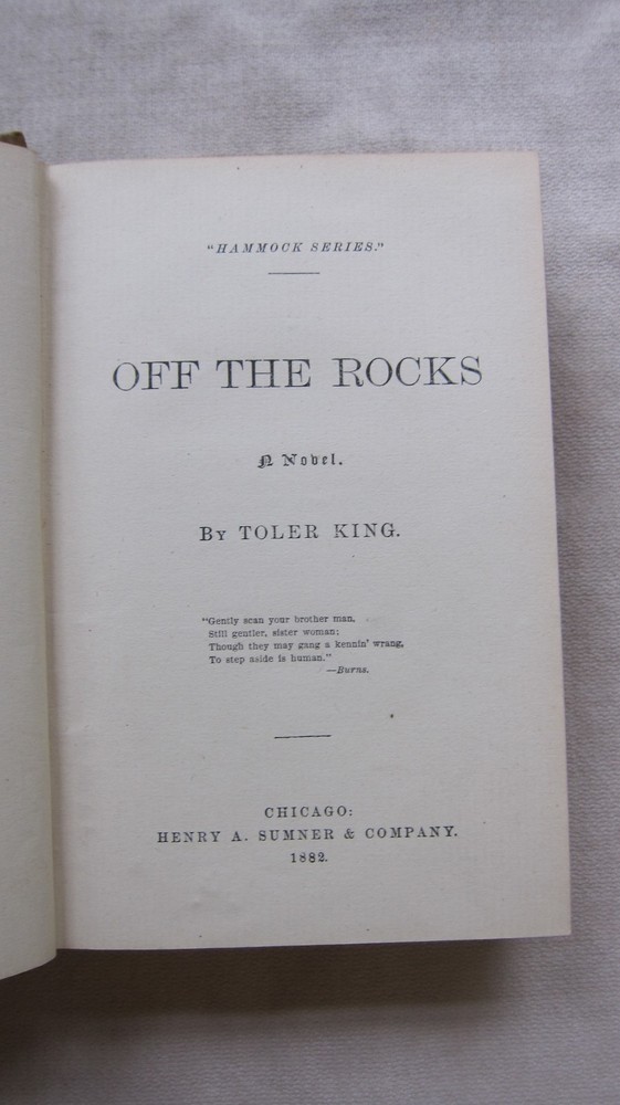 This is an old book, Off the Rocks by Toler King printed in 1882, a first edition. It is in good condition with some wear, tears and spots on the cover, the front cover is torn along the seam and is a little loose and there are some small spots, tears, poke marks and an erased price and initials. Shipping will be by media mail and must be calculated. Outside the US please use the Global shipping program. Please Note: I generally do not accept returns but if it should happen, the buyer must pay for all shipping costs. When an item is paid for it will ship within 3 days and you will get a tracking number. The tracking information will work as soon as the label has been scanned by the Post Office. If you don't get an email, it didn't go through or it went to your trash because it looked like spam. Please check this first before thinking I have not shipped your item. Also, I am out of town about 4 times a year for a week. I cannot remove over 1900 listings for that time. I will send a response to your payment and ship as soon as I get back. I am usually gone the first week in February, at the end of July and August and during Christmas week.