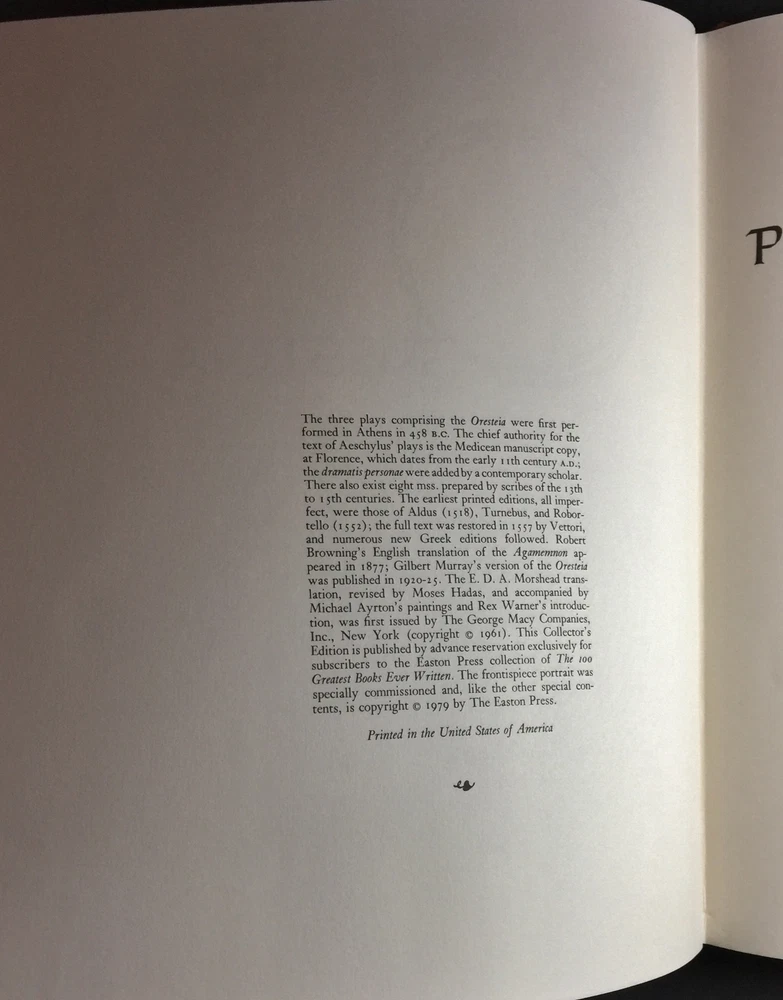 Oresteia by Aeschylus Part of the 100 GREATEST BOOKS collection of The Easton Press, Norwalk, Connecticut, 1979. This book is in excellent, unread condition. The Easton Press books are bound in genuine leather binding, with 22kt gold accents and hubbed spines, gilded page ends, acid-neutral paper, Moire fabric endsheets, and evocative illustrations and decorations. Your order will ship by the next business day after receiving payment. All items are from a smoke-free environment. Thank you, and Happy Reading!