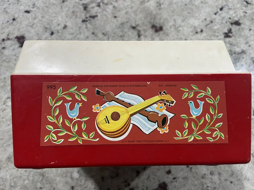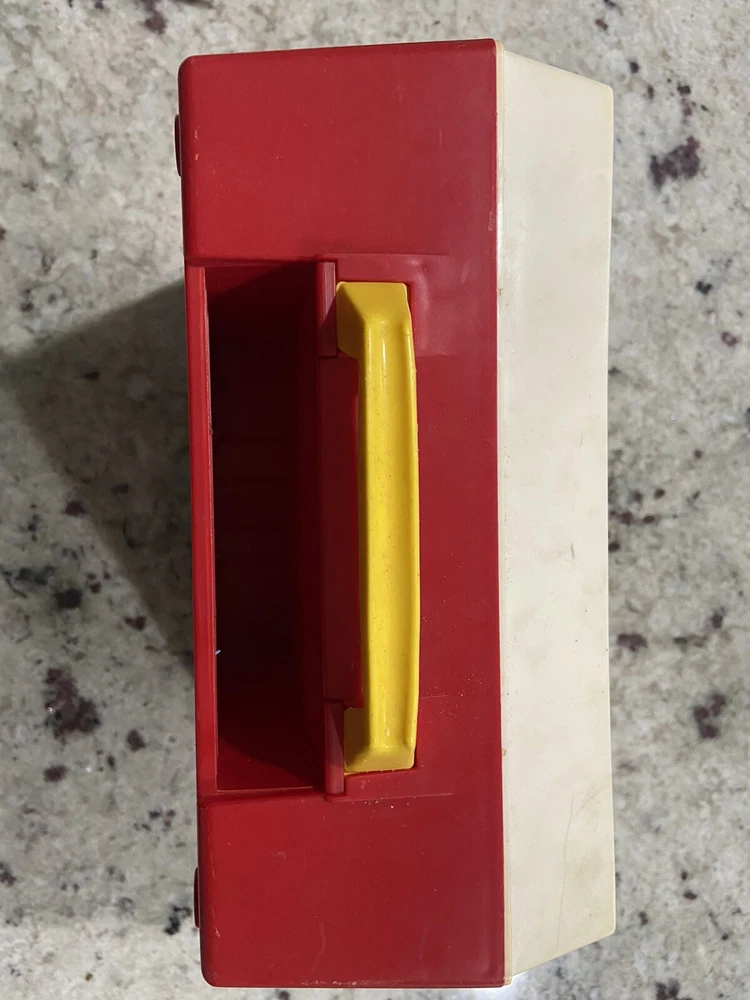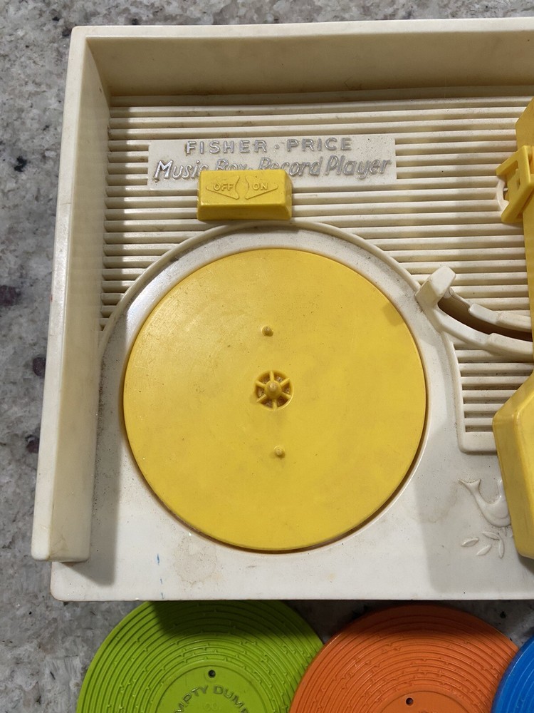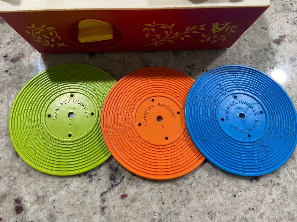 From a recent estate sale this is an Original 1971 Fisher Price Music Box Record Player. It comes with 3 discs! It weighs 2lb and it measures approximately 9x9.5x4.5”. It’s in good condition but does not work but it would be perfect for a collector!