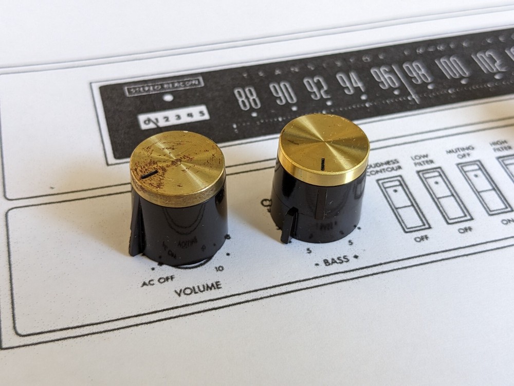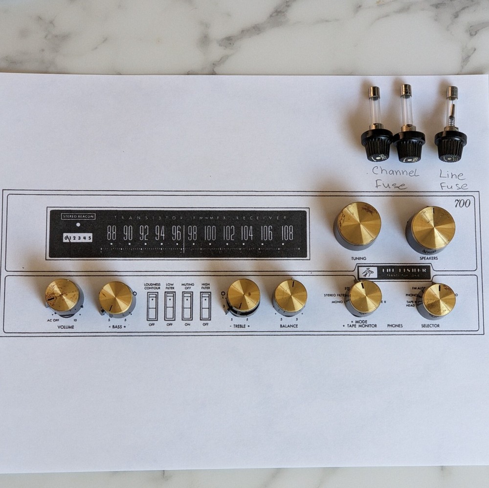 Knobs and fuse caps for Fisher 700T receiver. I recycled the non-working receiver itself long time ago and just found these parts. Each part is priced separately. Select the item you need to see the price. Shipping is the same or next day from California.