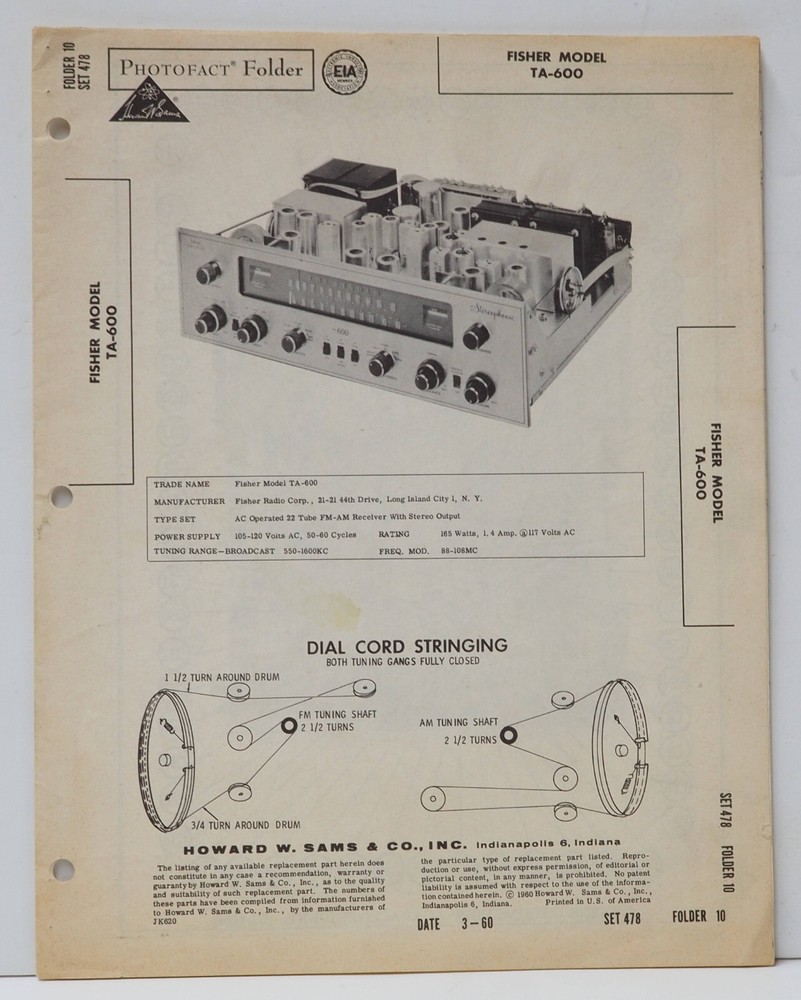 This is an Original Fisher TA-600 AM/FM Receiver Sams Photofact Set 478 Dated 3-1960. Very good condition. Includes parts list, schematic, photos, and much more.