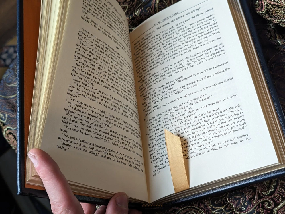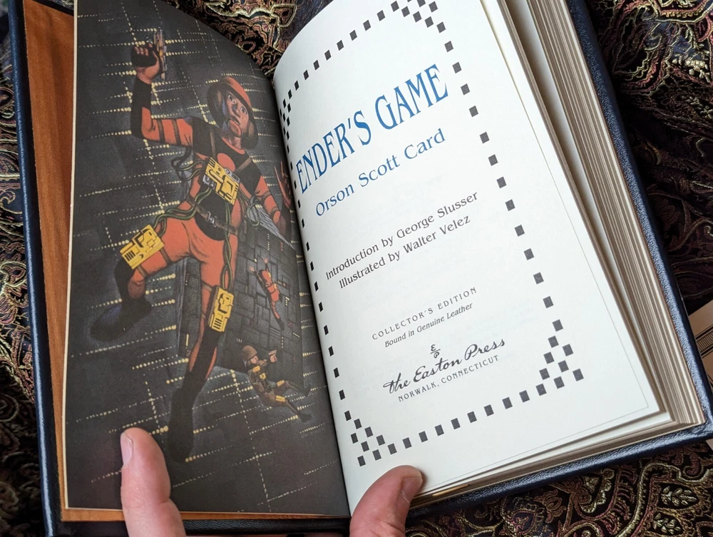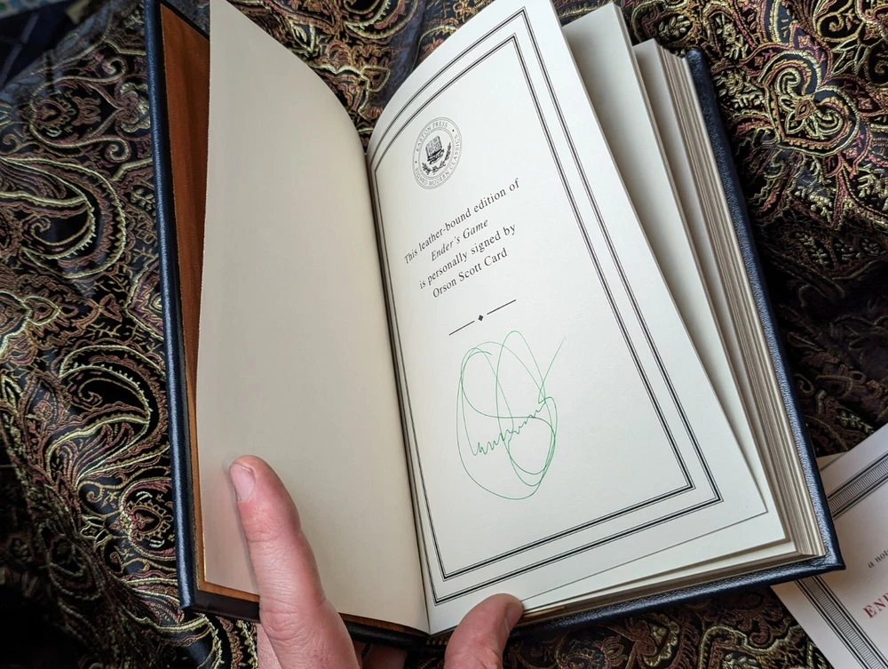 This is a rare opportunity to own a special edition of Orson Scott Card's Ender's Game. This book features a leather binding and is personally signed by the author. The edition is a collector's item and is sure to be a prized possession for any book collector. The book is in its original state and will be carefully packed and shipped as such. Get your hands on this classic read today! Book is published by Easton Press and includes certificate of authenticity, book plate, and card with info about Orson Scott Card. Signature is inside book in green ink. Excellent near mint condition!