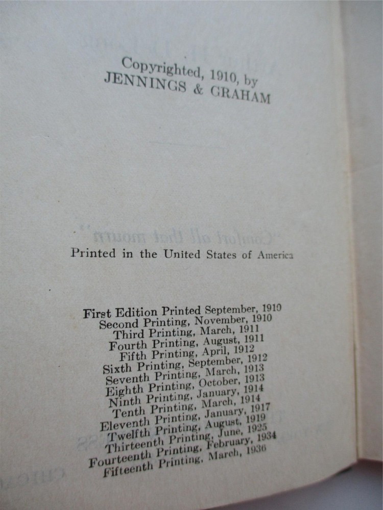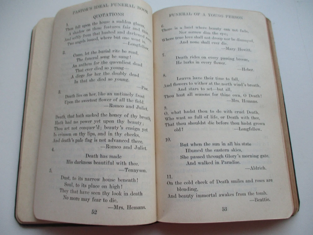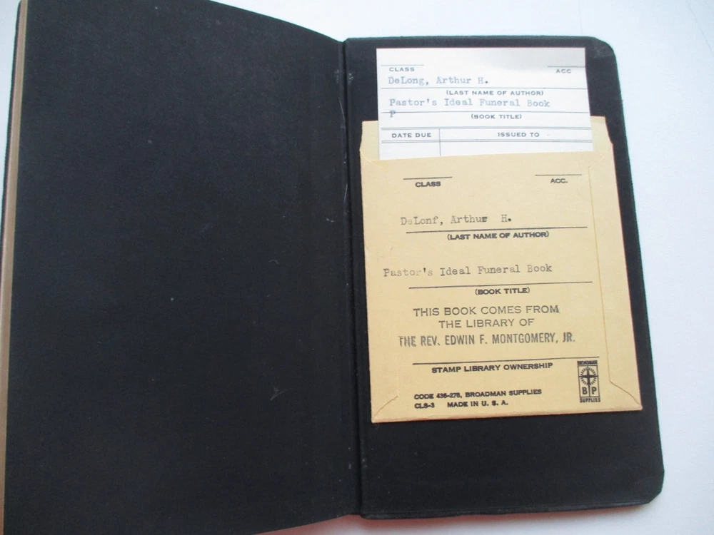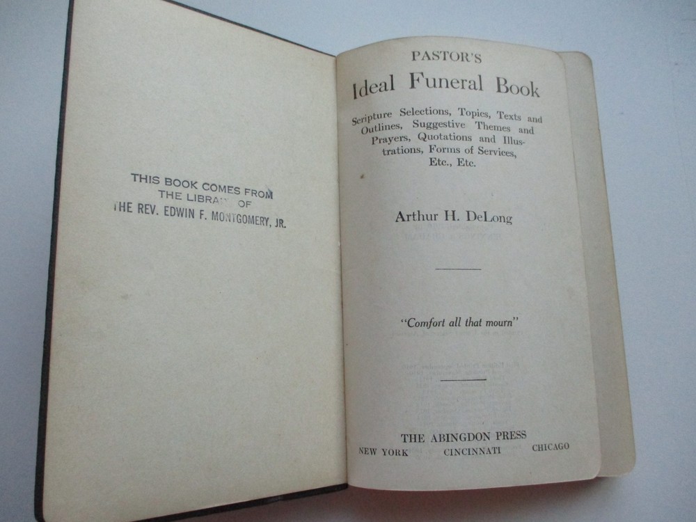 PASTOR'S IDEAL FUNERAL BOOK Arthur DeLong 1936 Abingdon Press Bonded Leather 15 PASTOR'S IDEAL FUNERAL BOOK Arthur DeLong 1936 Abingdon Press Bonded Leather 15 TITLE: PASTOR'S IDEAL FUNERAL BOOK AUTHOR: Arthur H. DeLong FORMAT: Small black leather book, with title and author's name in gold imprint on front cover, and gold gilt on page edges. Original Copyright 1910 by Jennings and Graham; this is the 15th Printing, March 1936. Includes lined pages for notes and a record of Funerals, which has 5 entries, all dated in 1940 and 1941. CONDITION: This small hardcover book is in gently used and GOOD, clean condition overall. It has clean covers with mild wear of corners. The spine has some separation at the Preface, but no loose or missing pages. On the page opposite the Title page, there is an ex-libris stamp with the former owner's name. On the back page there is a library card & pocket; otherwise, no writing or marks. Please see photos. PAYMENT & SHIPPING TERMS: Please pay within 3 days of item purchase. We ship promptly upon receipt of payment. Under policy, eBay is collecting state sales tax where appropriate. Our "Free Shipping" offer includes USPS Media Mail shipping in the USA. This rate typically delivers in 5-9 days but can take as long as 30 days to some areas. If you need your purchase right away, we strongly suggest you choose the Priority Mail option at checkout. International Buyers Please Note: * Import duties, taxes and charges are not included in the item price or shipping charges. These charges are the buyer's responsibility. * Please check with your country's customs office to determine what these additional costs will be prior to bidding/buying. * We do not mark merchandise values below value or mark items as "gifts" - US and International government regulations prohibit such behavior. Listing and template services provided by inkFrog
