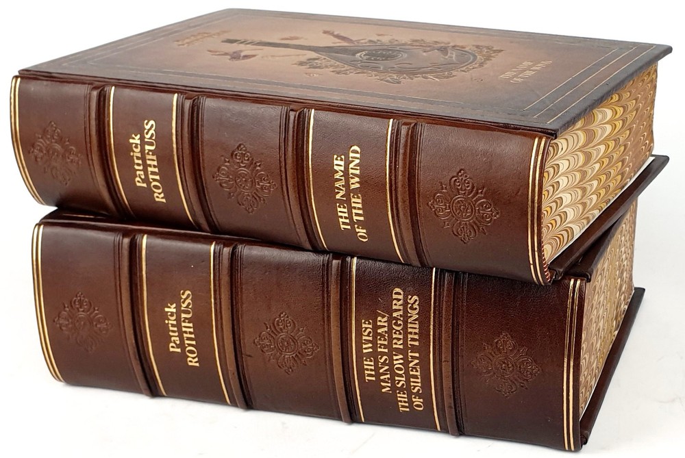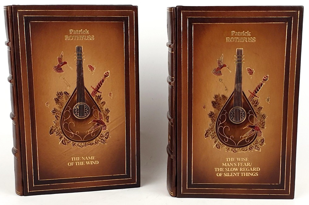 Antykwariat Sobieski/ Sobieski Antiquarian Bookstore presents PATRICK ROTHFUSS - THE KINGKILLER CHRONICLE SERIES [3 books complete set in 2 vol.] premium leather rebound Be sure to read the data about our company or the rarity of Polish books. Details under the photos. PATRICK ROTHFUSS THE KINGKILLER CHRONICLE SERIES [3 books complete set in 2 vol.] 1) The Name of the Wind 2) The Wise Man's Fear 3) The Slow Regard of Silent Things Gollancz 2008 The Name of the Wind (The Kingkiller Chronicle): 1: 'I have stolen princesses back from sleeping barrow kings. I burned down the town of Trebon. I have spent the night with Felurian and left with both my sanity and my life. I was expelled from the University at a younger age than most people are allowed in. I tread paths by moonlight that others fear to speak of during day. I have talked to Gods, loved women, and written songs that make the minstrels weep. The Wise Man's Fear (The Kingkiller Chronicle): Sequel to the extraordinary THE NAME OF THE WIND, THE WISE MAN'S FEAR is the second instalment of this superb fantasy trilogy from Patrick Rothfuss. This is the most exciting fantasy series since George R. R. Martin's A SONG OF ICE AND FIRE, and a must-read for all fans of HBO's GAME OF THRONES. The Slow Regard of Silent Things: A Kingkiller Chronicle Novella (Kingkiller Chronicle 3): Formerly a student at the University, now Auri spends her days tending the world around her. She has learned that some mysteries are best left settled and safe. No longer fooled by the sharp rationality so treasured by the University, Auri sees beyond the surface of things, into subtle dangers and hidden names. HARD COVER FULL LEATHER BINDING. SPINE WITH BINDING, EMBOSSING AND GILDED INSCRIPTIONS. AROUND THE COVERS A DECORATIVE EMBOSSED FRAME, IN THE CENTER OF THE FRONT COVERS, THERE ARE EMBOSSED, GOLD-PLATED AND HAND-PAINTED DECORATIONS REFERRING TO THE THEME OF THE PIECE. MARBLED ENDPAPERS AND FORE EDGES. LUXURY REBOUND. Condition NEW / BEAUTIFUL COPY The circulation of the binding for the English version is planned for 150 numbered copies. Copy number 3. NOTE: Handmade product made to order. The leather may vary slightly in texture or color. The paper of the endpapers and the color of the cutouts may be different. The photos are for illustration purposes only Online antiquarian Sobieski - a unique offer Sobieski Antiquarian Bookstore is an antiquities shop and an online store where you will find valuable, rare old books of high value and historical significance. We have been on the market for over a dozen years, collecting an impressive collection of unique works printed in Poland hundreds of years ago. What distinguishes us from other antique shops are not only beautiful things for sale, but also the form of activity - we work online, so that individual copies can be ordered from us online. All items come from legal sources - we can even issue a company certificate confirming the authenticity and originality of each item in our offer. Our assortment includes unique items on the bibliophile market, rare books and old prints, but also luxurious leather binding. A few notes for collectors from abroad. The rarity of Polish books. We make every effort to ensure that the facilities we offer are accurately described and photographed. Due to the history of the Polish state abounding in various armed conflicts, several partitions and partitions of Poland [when the country disappeared from the maps of the world and its culture was destroyed by the occupant], then the 2 world wars, followed by the time of sovietization and the People's Republic of Poland, antique books in Polish language are usually much more rare than their alternative editions in the world. When there are many copies of The Little Prince in the first edition on the international market, the first Polish edition from 1947 is a real rarity. When there are many copies of Kuba in the world, the Polish pre-war edition has appeared on the market several times in the last 25 years. It should also be added that in Poland we sometimes compromise by adding a title card or other cards or dust jacket in a copy [which of course is always marked], because for some titles it may not be possible to find a complete copy in life. Please keep these comments in mind. Polish antique books can be very rare! Execution of orders We operate quickly and efficiently - like any online store. All old books and even old prints from our offer can be ordered online via the website. We carry out orders by Poczta Polska or send them by courier. The order fulfillment time should not exceed 5 business days, most often we will prepare and send the shipment within twenty-four hours from the moment of placing and paying for the order. We work with domestic and foreign customers (in this case we set shipping costs individually). In the case of buying antique books, the age of which exceeds one hundred years and their value exceeds PLN 6,000. PLN - in the case of a single book or 15 thousand. PLN - in the case of a set, a permit for their export is required. Please do not be afraid, our second-hand bookstore will arrange all formalities related to obtaining the appropriate consent on your behalf.