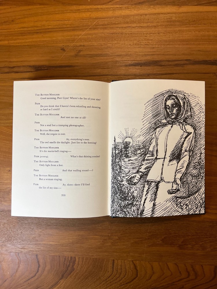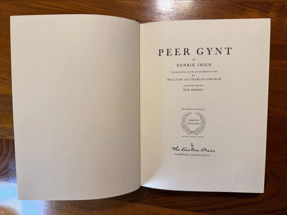 This Easton Press edition of *Peer Gynt* is stunning! The rich leather binding and Per Krohg’s captivating illustrations make it a perfect collector’s piece. The craftsmanship is impeccable—gilt-edged pages and a sewn-in ribbon bookmark add to its elegance. Henrik Ibsen's classic play feels even more special in this luxurious format. A must-have for literature lovers, it’s the kind of book that stands out on any shelf. Every detail screams quality, and the rarity makes it a true gem. Holding it feels like owning a piece of literary history—definitely worth the investment!