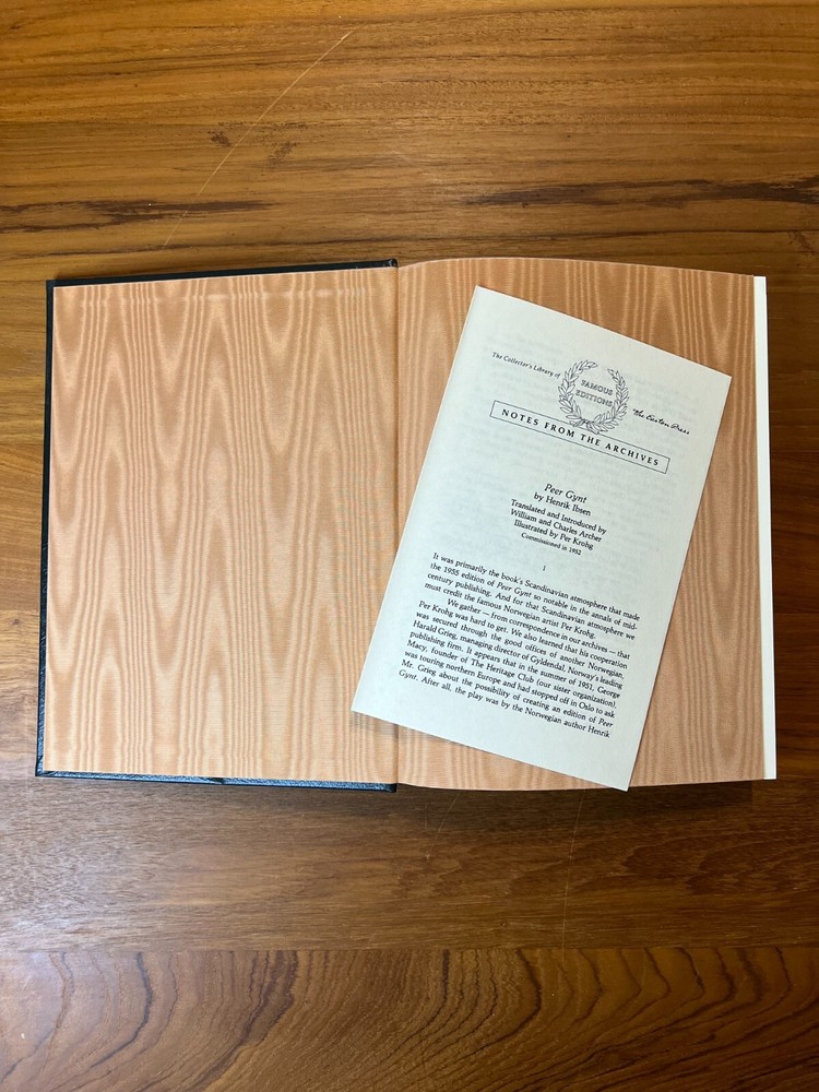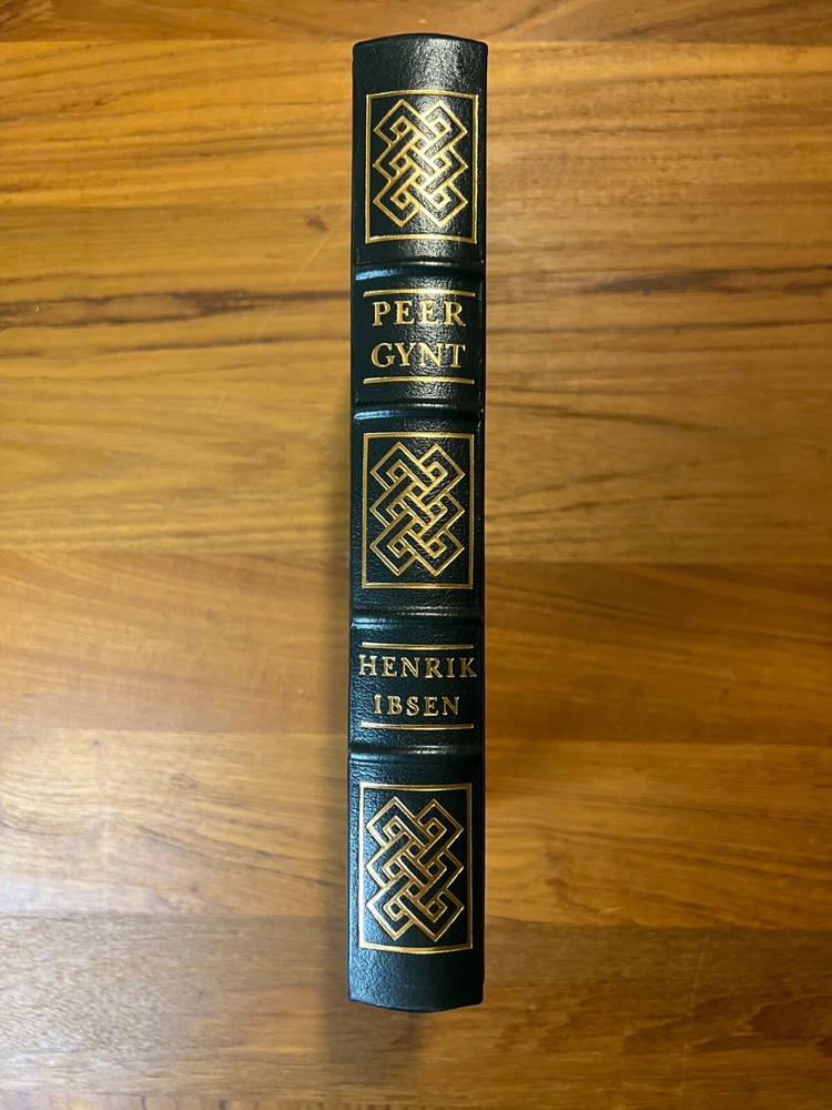 PEER GYNT - Easton Press - Henrik Ibsen - Leather Bound 1985 Famous Edition The product is a rare and collectible leather-bound edition of the famous play "Peer Gynt" by Henrik Ibsen, published by Easton Press in 1985 and illustrated by Per Krohg. This edition is a valuable addition to any collector's library, showcasing Ibsen's timeless work in a luxurious and durable format. With its high-quality craftsmanship and desirable characteristics, this edition is sure to be a treasured possession for fans of classic literature and collectors alike. The binding is square and tight. The pages are clean and unmarked. The gilt edges are clean. The condition is excellent.