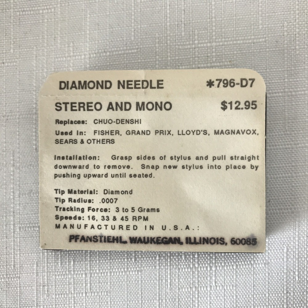 This Pfanstiehl #796-D7 needle is a genuine diamond-tipped replacement for record players and turntables. It is designed to fit Sears, Fisher, Magnavox, Lloyd's, Grand Prix, and Chuo-Denshi models. The needle is brand new and comes in its original packaging.
