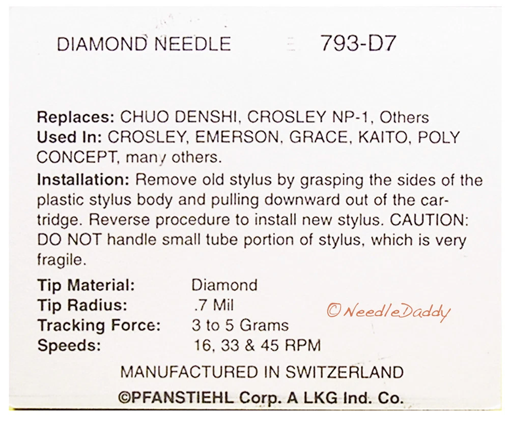 1ea. NEW IN BOX Pfanstiehl 793-D7 diamond replacement needle for VESTAX HANDYTRAX Steepletone RETRO ELTA Goldstar, Grand Prix, Sanyo, Fisher, Emerson, SOUNDESIGN, Yorx and m any Nostalgia record players being produced today. These include: COCA COLA CRATE, CROSLEY, EMERSON, LEETAC, MEMOREX, PHILCO, RCA MAGNOLIA CATHEDRAL, STUDEBAKER, TEAC AND THOMAS PACCONI, Anderson Nicholson's turntable,COCA-COLA CRATE, Crosley Turntable PAPRIKA - Conductor entertainment center CR-73 PA, CR49, CR711-BK, CR711-RE, EMPIRE,EMERSON,ION QUICK PLAY LP, ION POWER PLAY LP, ION QUICK PLAY FLASH, ION CONTOUR LP, ION VERTICAL VINYL, Leetac 402-M208-165 Leetac TAP-512, Leetac TAP-807, MEMOREX B0002Y3JRK, NEWPORT VICTROLA STYLE, Norm Thompson nostaligic turntable #15429 ORVIS SI72TK, Philco Retro Nostalgia PHILCO-SUITCASE, RCA-LAWTON 841.662 841.668 RCA Magnolia Cathedral Turntable 841.670, Chaplin Turntable RCA-CHAPLIN POLYFLAME NEWPORT Spectra Studebaker,TEAC MODELS SL-A100BK SL-A100RD GF-180 GF-600, THOMAS PACCONI TCP-MSE825, and many many more.. Manufactured in Switzerland to the highest quality standards. Be careful!! Compare your old needle to the pictures before making a purchase. If you need help then just attach a picture of your old needle to an ebay message and I will find the exact replacement stylus for you. REPLACES THESE NEEDLE NUMBERS: FISHER ST-05D, FISHER ST05D, FISHER ST-141, FISHER ST141, FISHER ST-707J, FISHER ST707J, MAGNAVOX 5690300007, MAGNAVOX 5690600006, PANASONIC CZ-800, PANASONIC CZ800, SANYO ST-05, SANYO ST-05D, SANYO ST05D, SANYO ST-141, SANYO ST141, SANYO ST-707J, teac stl-103, SHARP STY-146, SHARP STY146, SONY ND-152P, SONY ND152P. VESTAX VR-1SS, VESTAX VR1SS, GRACE GDI-NDL2 USED IN THESE CARTRIDGES : Chou Denshi CZ-800, PFANSTIEHL P-188D, PFANSTIEHL P-190D, SANYO MG-9, MAGNAVOX 569050007, SONY VX-52G, CROSLEY NOSTALGIA RECORD PLAYERS. .7 MIL P recision DIAMOND TIP PLAYS 33 AND 45 RPM rec ords onl y . 3 to 5 grams tracking force. T his needle will not play 78 rpm records. Many of these retro nostalgia record players are made to play all 3 speeds; 33, 45 and 78 rpm. However they only come with one needle. This needle has a .7 mil diamond that plays 33 and 45 rpm only. A needle with a .7 mil stereo tip will damage your 78 rpm records and you will need a needle with a 3 mil tip to play those. There is a handy link below that will take you to that needle. PLEASE READ! Please use the following information as a guide only. Compare your old needle to the pictures. If you don't have an old needle to compare t o then do not purchase the item. Not all Models are listed. Attach a picture of your needle to an ebay mail and I will help you find the exact replacement. USED IN CROSLEY MODELS: CROSLEY CR-27, CROSLEY CR27, CROSLEY CR-43, CROSLEY CR43, CROSLEY CR-44, CROSLEY CR44, CROSLEY CR-46C, CROSLEY CR46C, B ing Crosley, CROSLEY CR-48C, CROSLEY CR48C, CROSLEY CR-49B, CROSLEY CR49B, CROSLEY SUITCASE CR-49TA, CROSLEY CR49TA, CROSLEY CR-49TW, CROSLEY CR49TW, CROSLEY CR-50TW, CROSLEY CR50TW, CROSLEY CR-53, CROSLEY CR53, CROSLEY CR-67, CROSLEY CR67, CROSLEY CR-69, CROSLEY CR69, CROSLEY CR-70, CROSLEY CR70, CROSLEY CR-77D, CROSLEY CR77D, CROSLEY CR-78D, CROSLEY CR78D, CROSLEY CR-711, CROSLEY CR711, CROSLEY CR-712CD, CROSLEY CR712CD CROSLEY CR-86, CROSLEY CR86, CROSLEY CR-87CD, CROSLEY CR87CD, CROSLEY G6082, CROSLEY G-6082. USED IN CROWN MODELS: CROWN CD-3000, CROWN CD3000, CROWN MCK-260, CROWN MCK260, CROWN MCK-380, CROWN MCK380, CROWN MCK-550, CROWN MCK550, CROWN CD-2000, CROWN CD2000, CROWN CD-2500, CROWN CD2500, CROWN MC-44, CROWN MC44, CROWN T-70, CROWN T70, CROWN H-90, CROWN H90, CROWN MZ-1000, CROWN MX1000, CROWN MZ-200, CROWN MZ200, CROWN MZ-2100, MZ2100. USED IN DAEWOOD (DAYTRON) MODELS: DAYTRON ACD-450, DAYTRON ACD450, DAYTRON ACD-5050, DAYTRON ACD5050, DAYTRON AMC-450, DAYTRON AMC450, DAYTRON AMC-550, DAYTRON AMC550, DAYTRON AMC-680, DAYTRON AMC680. USED IN FISHER MODELS: FISHER GT-747, FISHER GT747, FISHER GXT-1707, FISHER GXT1707, FISHER GXT-707, FISHER GXT707, FISHER GXT-747, FISHER GXT747, FISHER ICS-716, FISHER ICS716, FISHER MC-617, FISHER MC617, FISHER MC-715, FISHER MC715, FISHER MC-715B, FISHER MC715B. DO NOT COPY, PASTE OR STEAL. USED IN GOLDSTAR MODELS : GOLDSTAR FMH-18, GOLDSTAR FMH18, GOLDSTAR GCD-31P, GOLDSTAR GCD31P, GOLDSTAR GCD-21P, GOLDSTAR GCD21P, GOLDSTAR GCD-82P, GOLDSTAR GCD82P, GOLDSTAR GSM-6306, GOLDSTAR GSM-6310, GOLDSTAR GSM6310, GOLDSTAR GSM-6920, GOLDSTAR GSM6920, GOLDSTAR GSM-9005, GOLDSTAR GSM9005, GOLDSTAR GSM-9010, GOLDSTAR GSM9010, GOLDSTAR GSM-X2, GOLDSTAR GSMX2. DO NOT COPY, PASTE OR STEAL. USED IN THE FOLLOWING GRACE T URNTABLE MODELS: Grace Digital Vinyl Writer USED IN GRAND PRIX MODELS: GRAND PRIX S-3550, GRAND PRIX S3550, GRAND PRIX S-7700, GRAND PRIX S7700, GRAND PRIX R5100, GRAND PRIX R-5100 GRAND PRIX 3000, GRAND PRIX 3300, GRAND PRIX 3600, GRAND PRIX 5000, GRAND PRIX 5330A, GRAND PRIX 5480, GRAND PRIX 5485, GRAND PRIX 5600, GRAND PRIX 5700, GRAND PRIX 6000, GRAND PRIX 6300, GRAND PRIX 6400, GRAND PRIX 6500, GRAND PRIX 6600, GRAND PRIX 7050, GRAND PRIX 7100, GRAND PRIX 9000, GRAND PRIX SA-156, GRAND PRIX SA156. USED IN J.C. PENNY, JC PENNY, PENNCREST MODELS: J.C. PENNY 1798, J.C. PENNY 1748, J.C. PENNY 1758, J.C. PENNY 1806, J.C. PENNY 1954, J.C. PENNY 1979, J.C. PENNY 1986, J.C. PENNY 1987, J.C. PENNY 1988, J.C. PENNY 6831825. USED IN MAGNAVOX MODELS: MAGNAVOX ACD195, MAGNAVOX ACD196, MAGNAVOX AH400, MAGNAVOX AH406, MAGNAVOX AH807, MAGNAVOX AH809, MAGNAVOX AS9300, MAGNAVOX AS9400, MAGNAVOX AS9406, MAGNAVOX AS9408, MAGNAVOX AS9500, MAGNAVOX AS9506, MAGNAVOX EC3085, MAGNAVOX EC3086, MAGNAVOX EC-3086, MAGNAVOX EC3095, MAGNAVOX EC3096, MAGNAVOX EC4010, MAGNAVOX EC4011, E C4015, MAGNAVOX EC4018, MAGNAVOX EC4019, MAGNAVOX EC6000, MAGNAVOX EC8000, MAGNAVOX EC8010, MAGNAVOX EC8100, MAGNAVOX EC9000, MAGNAVOX EC9015, FCD895, FCD196, MAGNAVOX MER054, MAGNAVOX MX8000, MAGNAVOX MX8010, MAGNAVOX MX8100, MAGNAVOX MX9000, MAGNAVOX MX9015, MAGNAVOX EC9020, MAGNAVOX M