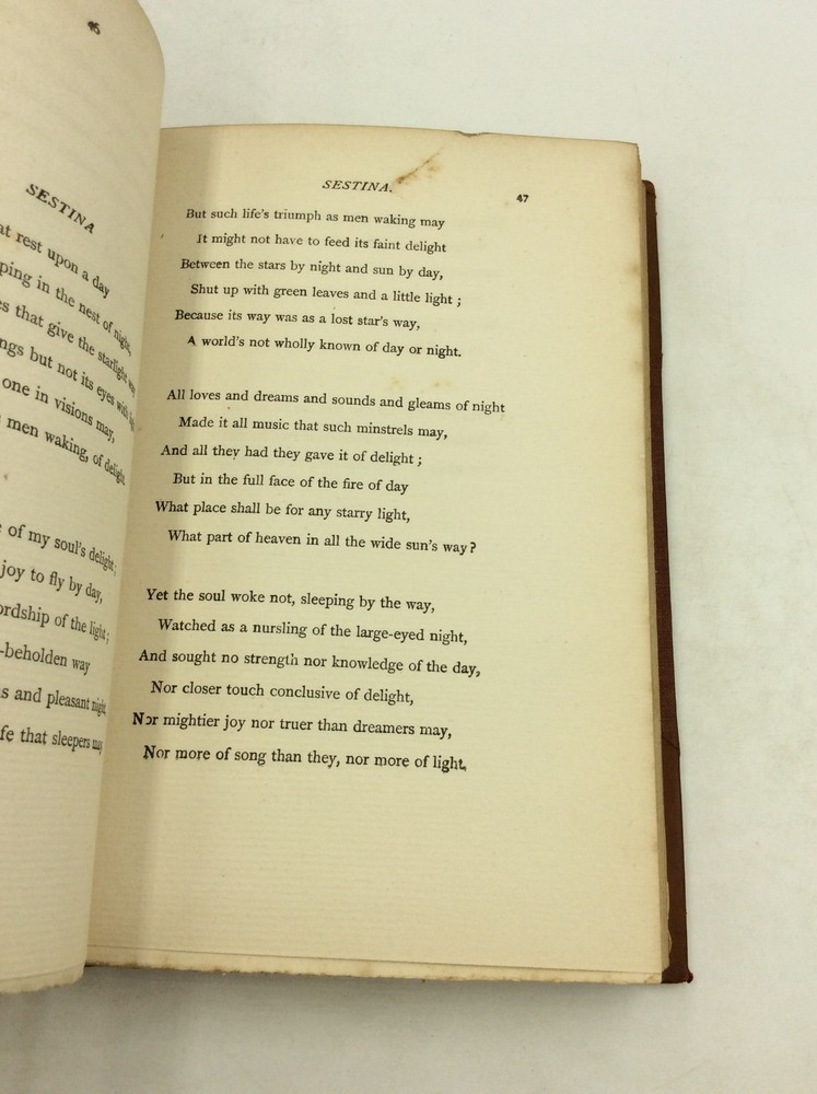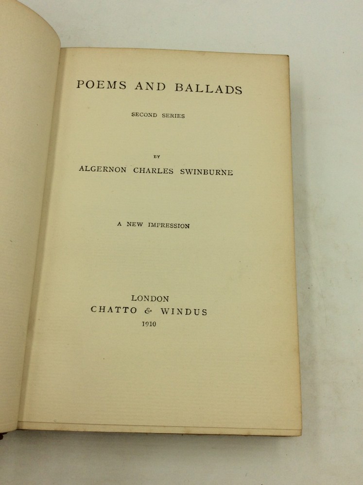 Algernon Charles Swinburne POEMS AND BALLADS: Second Series London: Chatto & Windus, 1910. Leather. 240p. A 3/4 brown leather, red linen cloth board hardcover book in very good condition. Spine and corners lightly rubbed. Otherwise clean and tight. Item #148650 A collection of poems by the 19th-century English playwright and poet. Marbled endpapers. Gilt decor and five raised bands on spine. Stated on title page as "A New Impression." This book is offered by Kubik Fine Books Ltd. Established in 1985, our store is in Dayton, Ohio, and specializes in rare/antique books of all types, with a special emphasis on history and theology. We are a member firm of the two most prestigious organizations in the rare books trade: the Antiquarian Booksellers Association of America (ABAA) and the International League of Antiquarian Booksellers (ILAB). As such, we are bound by their strict code of ethics and standards - in other words, you can trust us to be reputable, knowledgeable professionals. All items are guaranteed to be as described and can be returned for a full refund. Autograph material is guaranteed in perpetuity to be authentic. ORDER ADDITIONAL BOOKS AND SAVE! We will combine shipping on multi-book purchases. For shipments within the USA, shipping is $2.00 per book for each additional one purchased. Orders must be paid for at the same time. A FEW WORDS ON SHIPPING: Our shipping charges may be higher than other sellers. That's because we have a dedicated shipping employee and take care to make sure your orders are well-protected. Every item is wrapped in bubble-wrap; in addition, everything item which sells for over $10 is shipped in a sturdy cardboard box with cushioning materials. Over 95% of our orders are shipped within one business day of when we receive payment. If you buy it tonight, it's en route tomorrow!