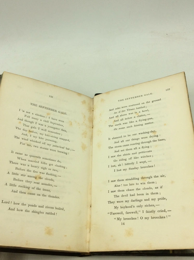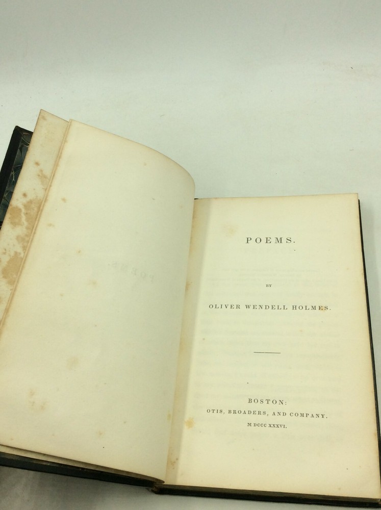 Oliver Wendell Holmes POEMS. Boston: Otis, Broaders, and Company, 1836. First Edition, First Printing. Leather. 163p. A hardcover book bound in full black leather with marbled foredges and endpapers. Very good condition overall. Small rub marks on the edges and spine, and foxing throughout the interior. The text is otherwise clean and the binding is secure. Item #200827 The first edition of Holmes' first book. A handsome 19th-century binding!