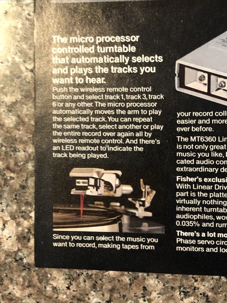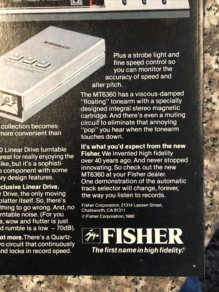PRINT AD 1980 Fisher MT6360 Linear Drive Turntable New 1st Name In High Fidelity. Original full page vintage magazine print ad.