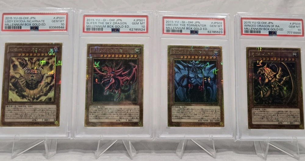 This PSA 10 Yu-Gi-Oh Millennium Box set is a must-have for collectors! The Egyptian God cards and Exodia look stunning in gold foil, and the legendary Exodia Incarnate is a rare gem. The condition is flawless, making it perfect for display or investment. A true treasure for any Yu-Gi-Oh fan!