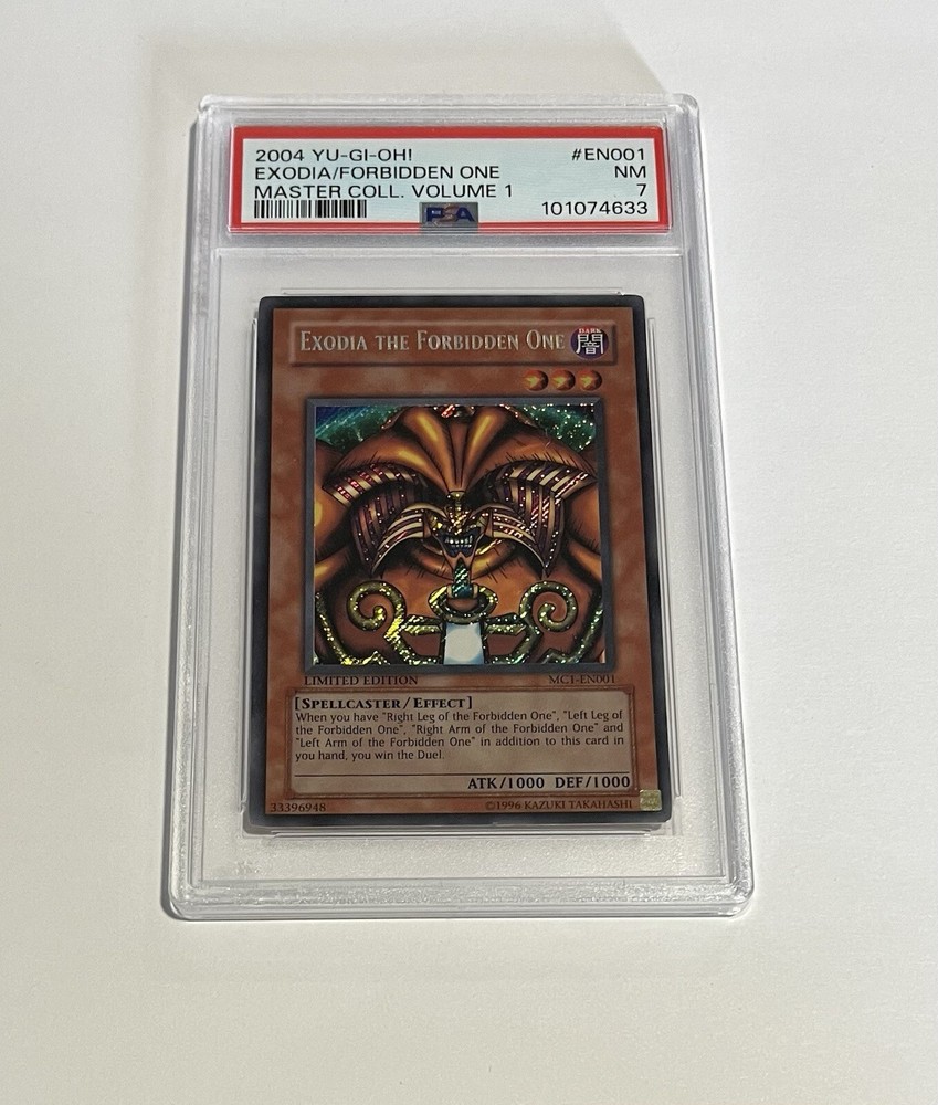 1x 2004 Yu-Gi-Oh! Exodia The Forbidden One #MC1-EN001 Secret Rare Limited Edition card. (PSA 7 Near Mint) This is a Exodia The Forbidden One card from the Master Collection volume 1 Set in the Yu-Gi-Oh! TCG. It is an Secret Rare card with 1000 Attack/Power and 1000 Defense/Toughness. The card is an Effect type with a Holo finish. It is manufactured by Konami and has the card number MC1-EN001.