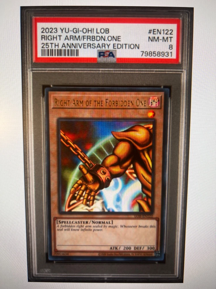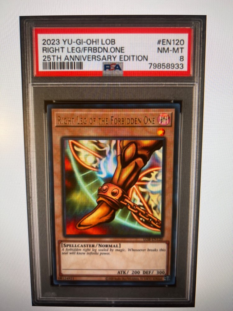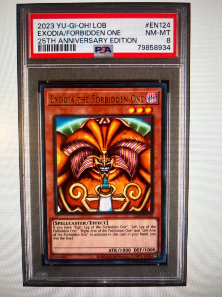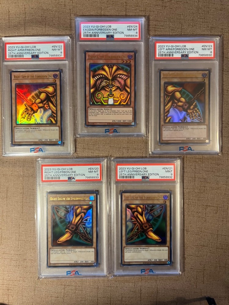 YUGIOH 2023 25th anniversary edition EXODIA THE FORBIDDEN ONE COMPLETE SET ALL PSA 8 & 9 ALL PSA NUMBERS ARE IN SEQUENCE Cards pictured are the ones that you will receive L Arm PSA 8 # 79858930 R Arm PSA 8 # 79858931 L Leg PSA 9 # 79858932 R Leg PSA 8 # 79858933 Exodia psa 8 # 79858934 WOW !!!!! Signature required Wrapped in bubble wrap shipped in a box Thanks