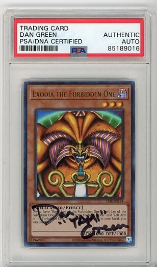 Unleash the power of Exodia the Forbidden One with this Ultra Rare Yu-Gi-Oh! TCG card from The Legend of Blue Eyes White Dragon set. Featuring the iconic Spellcaster type monster, this card boasts an attack and defense power of 1000, making it a formidable addition to any deck. Authenticated by PSA, the card is also hard-signed by Dan Green, adding a personal touch to this collectible piece. The English language card, numbered LOB-124, showcases a stunning Holo finish that captures the eye and enhances its timeless appeal. With its unlimited features, this card is a must-have for both players and collectors alike, ready to take center stage in your next duel or display case.