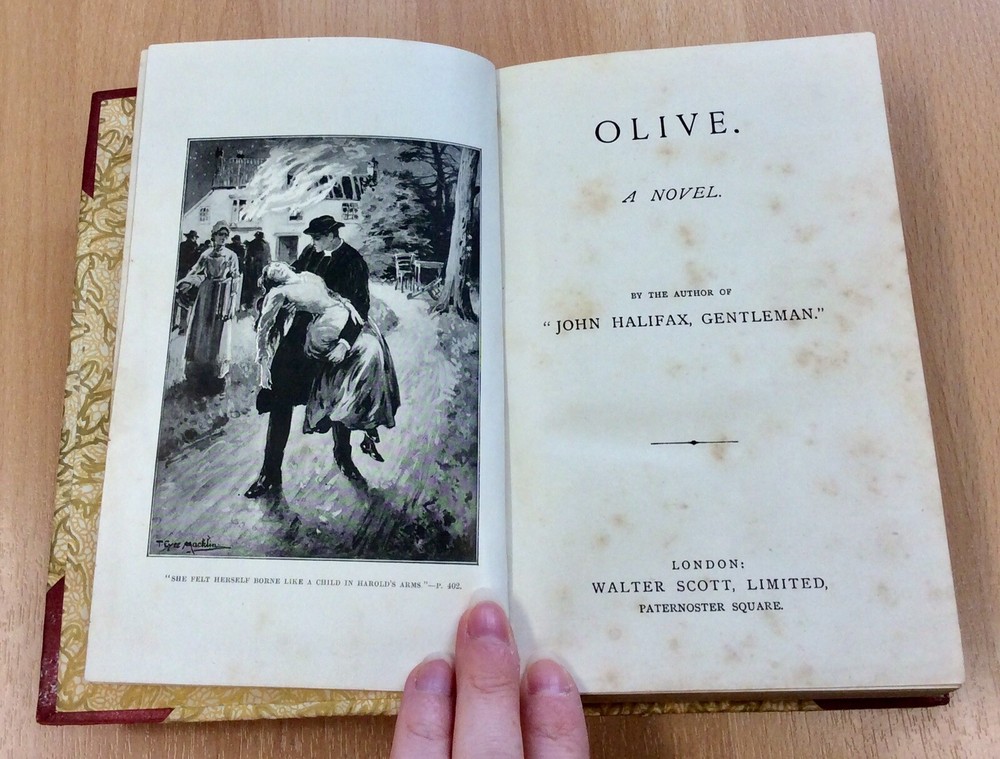 Partially leather-bound edition of Olive, A Novel, with an inscription dating it to 1899. Has heavy foxing to the early pages, but is otherwise clean, complete and intact. Ideal as a reading copy....
