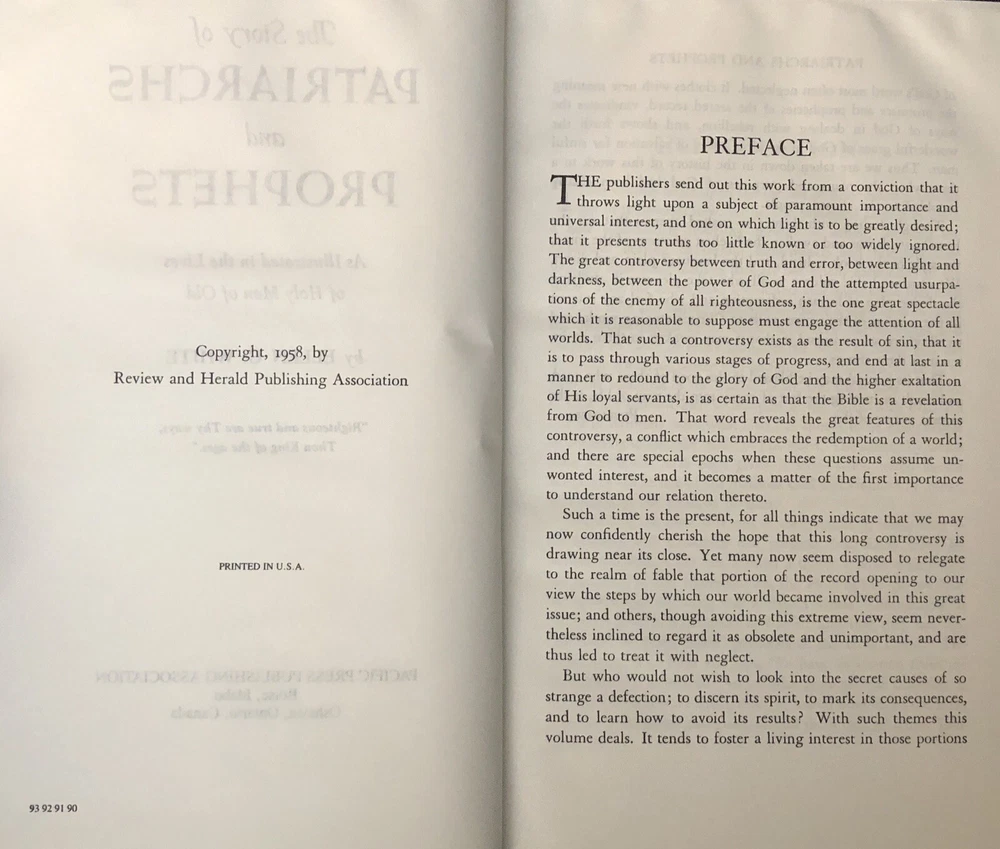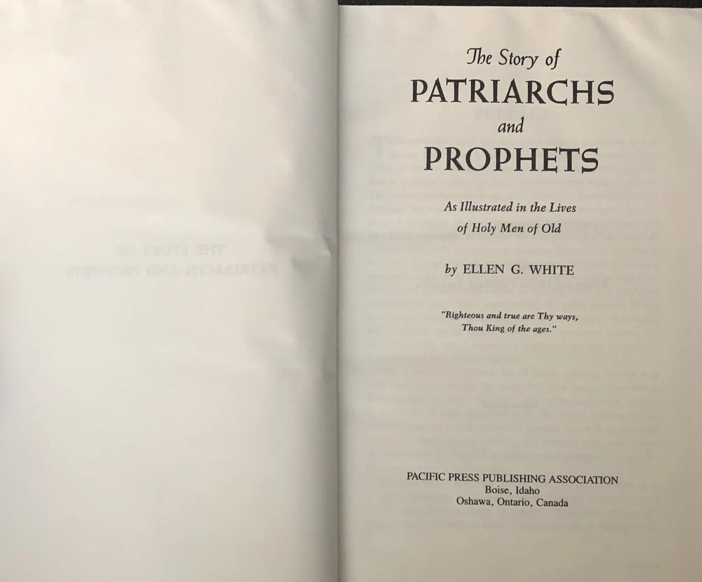 Patriarchs and Prophets. By Ellen G. White. © 1958. 1993 printing date. Pacific Press Publishing Association. Maroon Faux Leather hardcover with gilt lettering. 805 pages. 8-1/4" x 5-3/8" x 1-3/16". Condition is good. Shipped via USPS Media Mail. A portion of the proceeds from the sale of this listing will go towards an annual scholarship for a worthy student at Milton-Stateline Seventh-day Adventist School in Milton-Freewater, Oregon.