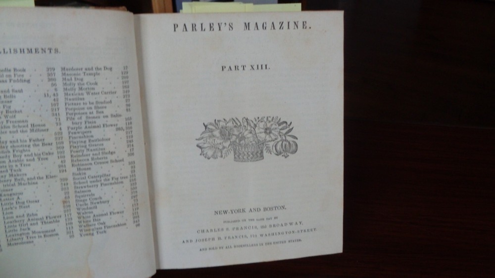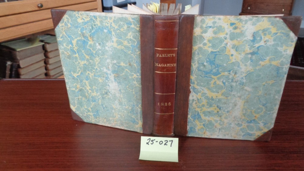 Peter Parley’s Magazine . Bound in three quarter leather (leather spine and corners) with marbled paper. Publisher: Charles S. Francis and Joseph H. Francis and Co., New York, 1936. Parts XIII, XIV, XV and XVI. Binding is in very good condition rubbing to the marbled paper. Contents clean and bright, twelve illustrations with water-coloring. Spine lettering tooled in gold. 384 Pages. 5 ¾ x 6 ¾ inches. Illustrated with numerous in-text engravings. Over-all a nice tight copy. Inventory #25-027. Price: $125.