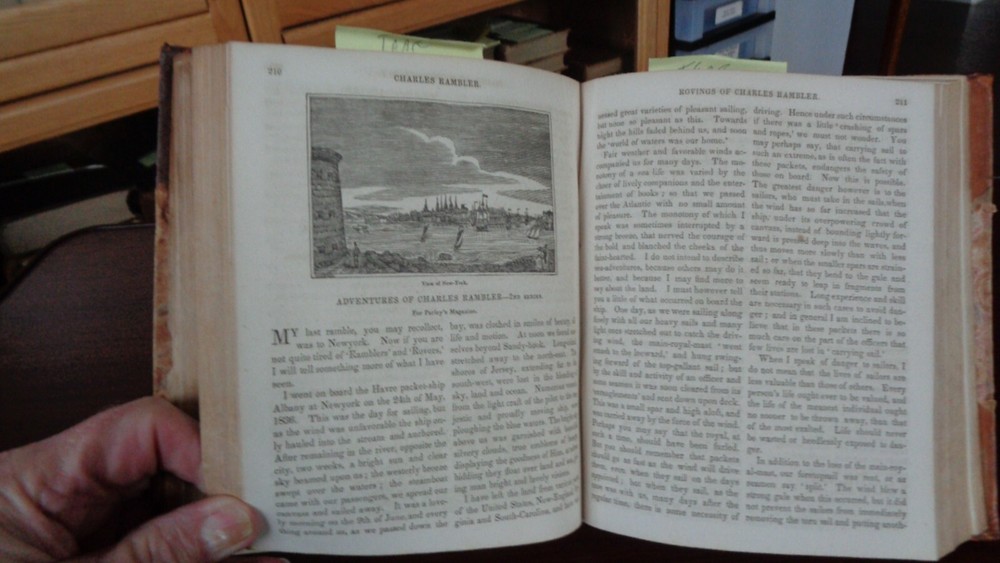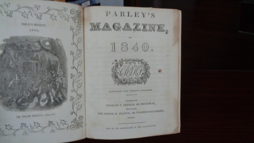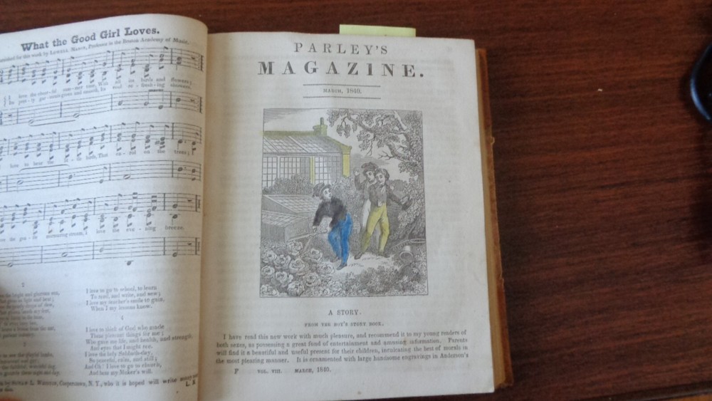 Peter Parley’s Magazine for 1840 . Bound in three quarter leather (leather spine and corners) with marbled paper. Publisher: Charles S. Francis and Co., New York, 1940. Parts XXIX-XXXII (Jan-Dec). Binding is very good condition rubbing to the marbled paper, slight wear to the spine. Contents clean and bright, one illustration with water-coloring and a few spots of foxing. Pastedowns and ffep heavily foxed front and back. Spine lettering tooled in gold. 384 Pages. 5 ¾ x 6 ¾ inches. Illustrated with numerous in-text engravings. Over-all a nice tight copy. Inventory #25-031. Price: $125.