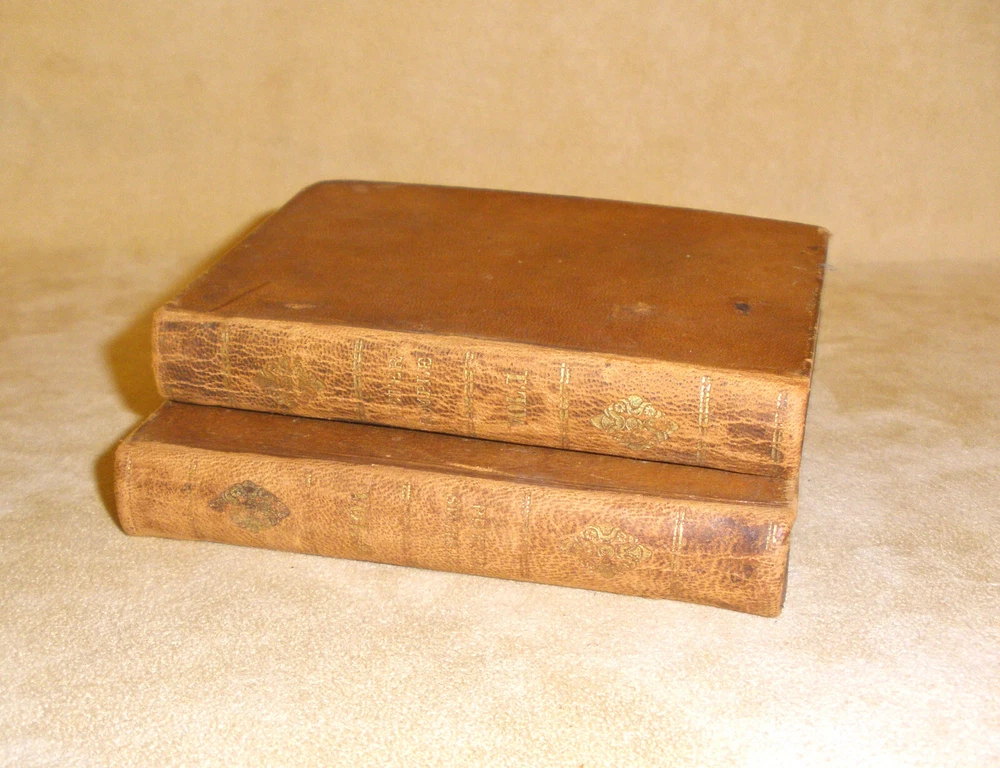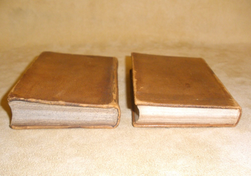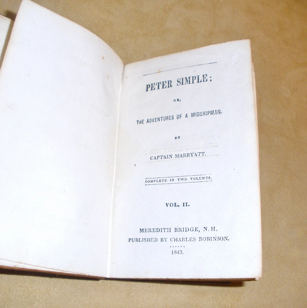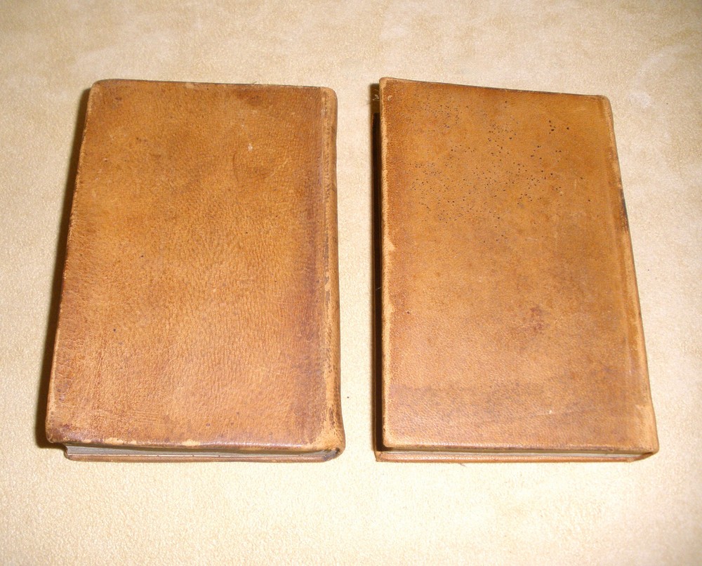Hello, up for purchase is a very nice set of small leather bound books dating from 1843. It's a two volume set and is entitled Peter Simple or The Adventures of a Midshipmanm and was written by Captain Marryatt. The books measure 4 3/4 inches tall and 3 1/8 inches wide. Regarding condition, I'm not skilled in judging condition on books that are 179 years old. The bindings are fully intact with no missing pages. The pages have darkened around the perimeter, have some creases on the top corners, and are crinkled from heat and cold over the years. The books will be shipped wrapped in bubble wrap and in a box. Any other questions? Please ask. Thanks Thanks for looking! Please check out the other items in my store. I am very flattered when someone wishes to purchase more than one item from my store. I will gladly combine shipping expenses. Please click on the "buy it now" button for each item desired, then request me to send you the total owed once you're finished. I will package the items and send an invoice based on the weight.