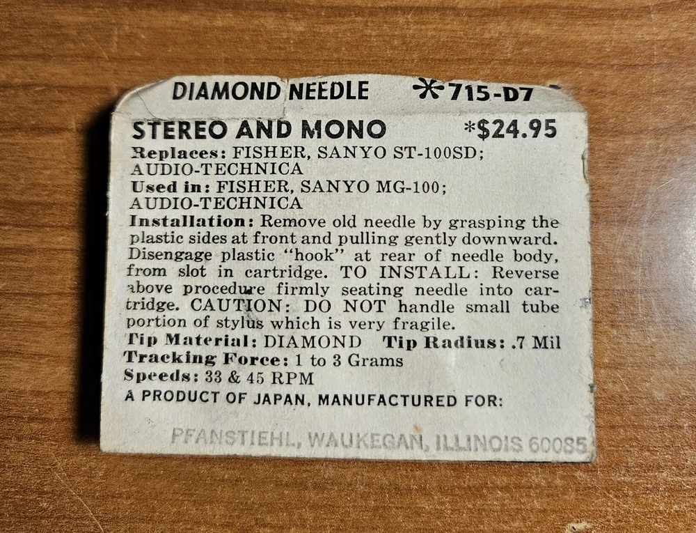 Replaces: FISHER, SANYO ST-100SD Used in: FISHER, SANYO MG-100; AUDIO-TECHNICA Tip Radius: .7 Mil Tracking Force: 1 to 3 Grams Acquired from an estate sale, don't know much about it, just trying to pass it on to someone who might find it useful.