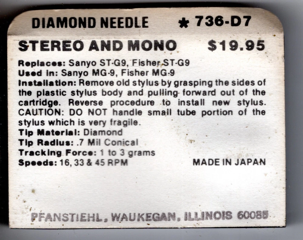 Item Description Pfanstiehl Phonograph Replacement Needle/Stylus Diamond Needle *736-D7 Replaces: Sanyo ST-G9, Fisher ST-G9 Used in: Sanyo MG-9, Fisher MG-9 Tip Material: Diamond Tip Radius: .7 mil Conical Tracking Force: 1 to 3 grams Speeds: 16, 33 & 45 rpm New, Old Stock SHIPS FREE! Pictures are taken by me of the actual item you are purchasing, not stock or stolen photos. Please review the pictures carefully! Domestic economy shipping via USPS is FREE! USPS Priority Mail is available for single items for $14.99. Purchase 3 or more of my 'FREE SHIPPING' items at one time using the E b a y 'Shopping Cart' feature and they ship via USPS Priority Mail for FREE! To Canada, UK, France, Germany and Australia shipping via USPS First-Class Package International service is now available (Up to 4 pounds)! All other International shipping via USPS Priority Mail ONLY. Thanks for visiting Sew Many Stitches and Things! General Shipping & Handling Information I ship via USPS to your confirmed E b a y shipping address, and can accommodate other reasonable requests. I make every effort to ship the next business day after receiving cleared payment. Local pick up is allowed for most items and required for certain items. I do combine shipping where possible to save you money! If you are bidding on other of my auctions that end within a 3 day period, please let me know and I will send an invoice after the last auction has ended, including the combined shipping! International buyers are responsible for all taxes, duty and customs fees. Payments Payment is expected within 4 days unless prior arrangements have been made. If you are going to have difficulty making payment, PLEASE just contact me! I know things come up and am happy to work with my customers! If you have questions or need additional information, ask BEFORE bidding and I will try to get the information for you as soon as possible. Feedback I will leave positive feedback for you when you pay in a timely manner. I will ship your item(s) quickly and would appreciate positive feedback after you receive your item. If for any reason you feel you cannot leave positive feedback and 5 star detailed seller ratings, please contact me first and give me an opportunity to make things right. Thank You! ****Allergy Alert**** I have a bird and rabbit in my non-smoking home.