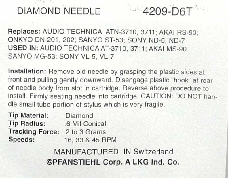 Phonograpgh Needle Sanyo Fisher ST-53D ST38VD MG53D Sony VL-5 VL-7 ND-5 ND-7E Description Diamond Tip with a .6 Mil conical radius Tracking Force: 2 - 3 grams Speeds: 13, 33 & 45 RPM Made in Switzerland FAST & FREE Shipping! Pfanstiehl has been in the turntable needle business for over 90 years - longer than anyone else! PLEASE NOTE: Make sure the needle that you are buying looks exactly like the one you are replacing, if the cartridge has been changed, the stylus may not fit. If you are unsure, please don't purchase Replaces the following needles: Audio Technica ATN-3710, ATN3711, ATN-3721, ATN-3710, ATN-3711, ATN-3711E, ATN-3712E, ATN-3712, ATN-3710L Aiwa AN7, AN-7 Akai RS-90, RS-95 Garrard GA-150 Marantz CT-6S Onkyo DN201, DN-201ST, DN-201STE, DN-202 Panasonic EPS76STSD, EPS76STED Radio Shack 970-1101, 420-2853 Sanyo Fisher ST-53D, ST38VD Sony ND-5, ND-7E Used in the following cartridges: Audio Technica AT-3710, AT-3711, AT-3721, AT-3711, Akai PC90, PC-90 PC95, PC-95 Onkyo OC-201V, OC-202V Panasonic EPC-76SMAD, EPC-76SMED Sanyo Fisher MG53D Sony VL-5, VL-7 We try to describe items to the best of our ability and would not misrepresent anything intentionally. We can sometimes overlook something or make a mistake. We are not experts on everything we sell. Please look at the pictures for condition and email us with any questions. If there are any problems, please email us for a swift solution. See my other listings for more great items! Payment PAYMENT: We only accept PayPal. Shipping We ship within 1 day of receiving PayPal payment. . Feedback Contact eBay Store Showcase by Seller SourceBook txzj pxzj2835 txzj67