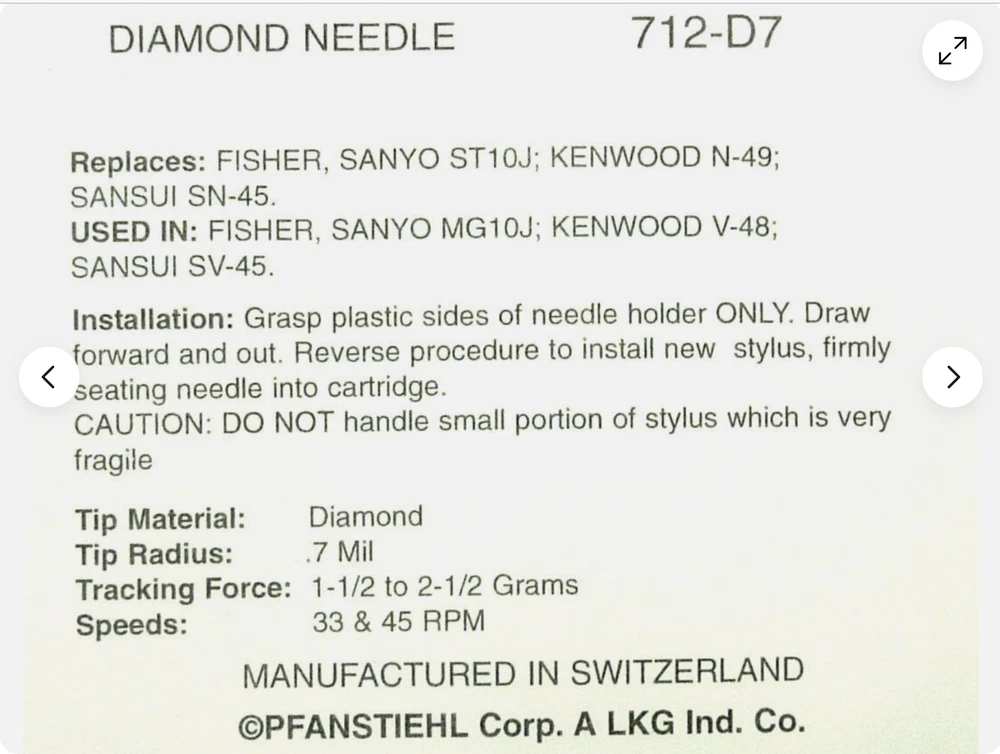 Be careful! Compare your old needle to the pictures before making a purchase. Need help? Attach a clear picture of your old needle to an ebay message to me. I will find the needle for you. 1 EA. NEW IN BOX PFANSTIEHL 712-D7 DIAMOND REPLACEMENT STYLUS FOR FISHER, SANYO, ONKYO, KENWOOD AND OTHER TURNTABLES. REPLACES THE FOLLOWING NEEDLES: AUDIO TECHNICA ATN952, AUDIO TECHNICA ATN-952, PFANSTIEHL 712-D7, SANYO FISHER ST-10J, SANYO FISHER ST10J, SANYO FISHER ST-43D, SANYO FISHER ST43D, SANYO FISHER ST-11D, SANYO FISHER ST11D, SANSUI SN-45, SANSUI SN45, MITSUBISHI 3D-44M, MITSUBISHI 3D44M, KENWOOD N-49, KENWOOD N49. USED IN THE FOLLOWING CARTRIDGES: FISHER SANYO MG-10J, SANYO FISHER MG-43, FISHER SANYO MG10J, ONKYO OC-40, ONKYO OC40, SANYO FISHER MG43, SANSUI SV-45, SANSUI SV45, AUDIO TECHNICA 952, MITSUBISHI MAG-4, KENWOOD V-49, KENWOOD V49. USED IN THE FOLLOWING FISHER MODELS: FISHER ACS100, FISHER ACS105, FISHER ACS108, FISHER ACS110, FISHER ACS116, FISHER ACS122, FISHER ACS125, FISHER 105, FISHER 108, FISHER 110, FISHER 1100, FISHER 122, FISHER 125, FISHER 3100, FISHER 3200, FISHER 3300, FISHER ICS580, FISHER MC4561, FISHER MT6117, FISHER ACS-100, FISHER ACS-105, FISHER ACS-108, FISHER ACS-110, FISHER ACS-116, FISHER ACS-122, FISHER ACS-125, FISHER ICS-580, FISHER MC-4561, FISHER MT-6117. USED IN THE FOLLOWING SANYO MODELS: SANYO H20, SANYO H20, SANYO TP-1005, SANYO TP1005, SANYO TP-1010, SANYO TP1010, SANYO TP-30, SANYO TP30, SANYO TP-B2, SANYO TPB2. . 7 MIL CONICAL DIAMOND PLAYS 16, 33 AND 45 RPM. 1.5 TO 2.5 GRAMS TRACKING FORCE. Search my store for your needle, cartridge or other turntable accessories. Email me for help.
