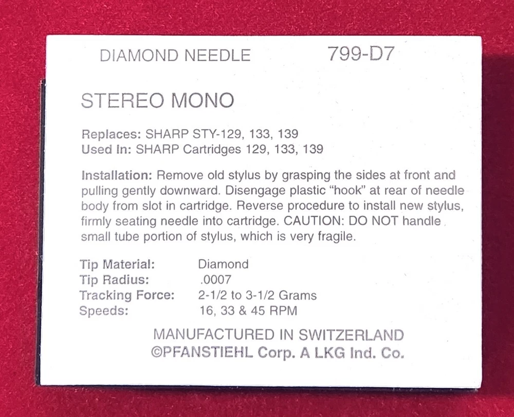 Brand New Pfanstiehl replacement stylus Tip: 7 Mil Conical Diamond Tracking: 2.5 to 3.5 Grams Speeds: 16, 33 & 45 RPM Made in Switzerland Replaces the following needle: FISHER STP-50J STP50J KENWOOD N-64 N64 N-64C N64C MARANTZ TT-253 TT253 TT-353 TT353 CTS-243 CTS243 CTS-143 CTS143 TT-143 TT143 TT-243 TT243 TT-143 TT143 MITSUBISHI MGA N-5786 N5786 SANYO STP-50J STP50J SHARP STY-129 STY-133 STY-139 TOSHIBA N-78D N78D YAMAHA N-8100 N8100 Used in the following cartridges: KENWOOD CARTRIDGES V-64 V64 V-64C V64C MITSUBISHI MGA CARTRIDGE RS-50 RS50 SHARP CARTRIDGES 129 133 139 TOSHIBA CARTRIDGES C-78 C78 YAMAHA CARTRIDGES CG-8100 CG8100 Used in the following models: KENWOOD MODELS HD-770 HD770 HD-770R HD770R HD-770M HD770M HD-990R HD990R HD-990W HD990W KP-747 KP747 M-7S M7S P-5S P5S P-7S P7S ROXY-D5 ROXYD5 ROXY-D7 ROXYD7 ROXY-D9F ROXYD9F KD-74 KD74 MITSUBISHI MGA MODEL LT-156 LT156 FAST & FREE Shipping! PLEASE NOTE: Make sure the needle that you are buying looks exactly like the one you are replacing, if the cartridge has been changed, the stylus may not fit. If you are unsure, please don't purchase