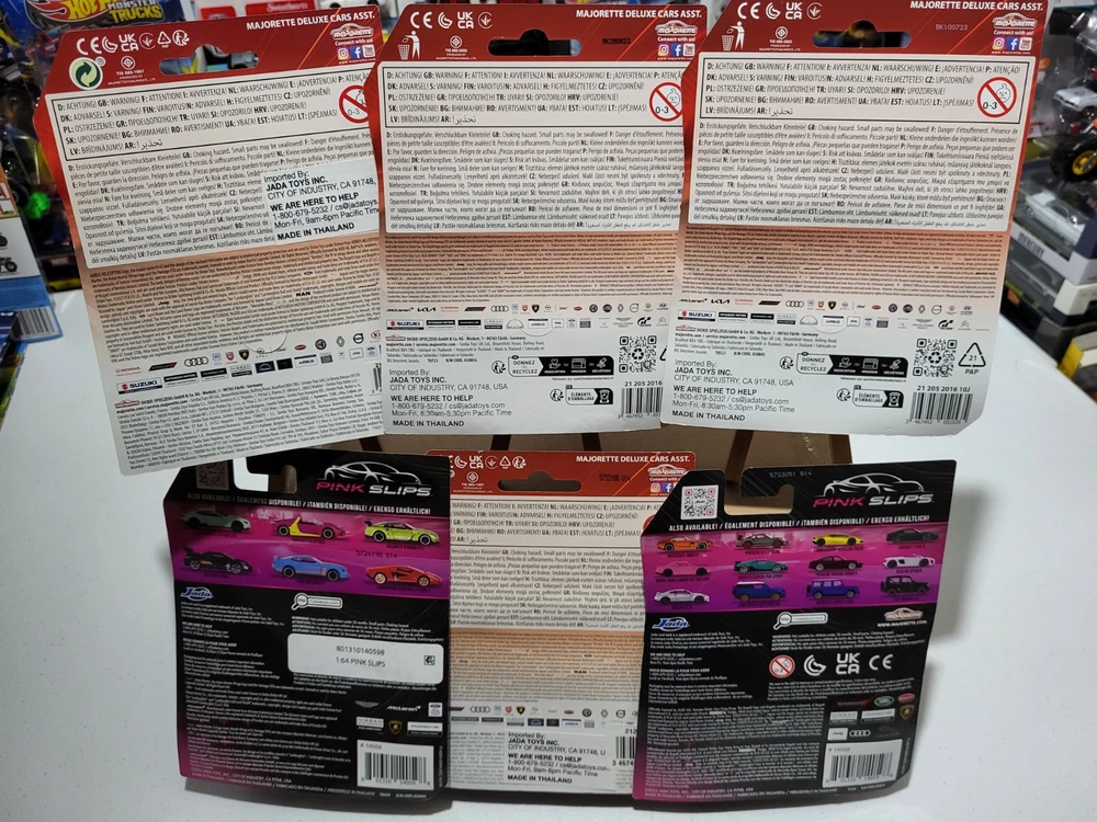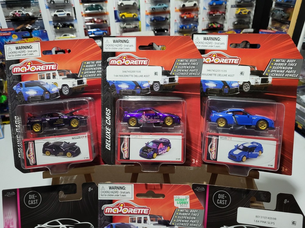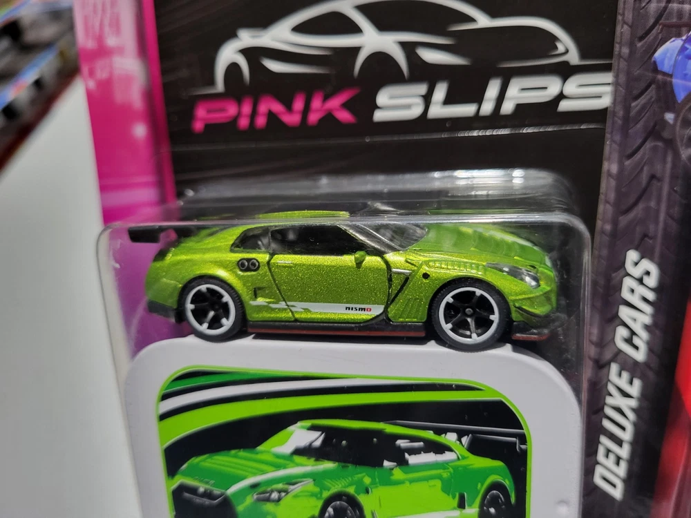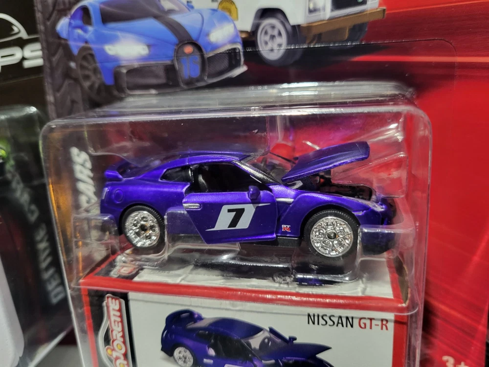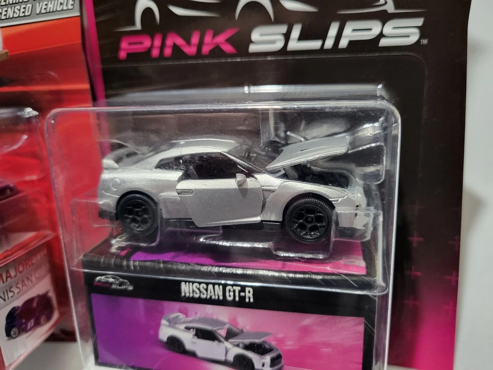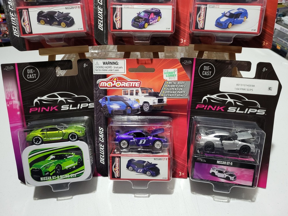Jada Pink Slips and Majorette Nissan GT-R set of 6. Pink Slips are Lime green and Silver metallic. Majorettes are Blue, Purple, Violet, and Plum purple. Diecast, 1:64 scale with chrome, gold, and black wheels with rubber tires as well as fully functional opening hoods and doors. These cars are being sold as pictured in like new condition with perfect blisters and good cards. Will be shipped in bubble wrap and a box. I have been a Hot Wheels and die-cast collector for over 10 years with an expansive personal collection, so I understand what is expected of condition as well as required care when shipping. That said, I am new to selling on Ebay so please have patience. I will gladly answer any questions as well. Thanks!