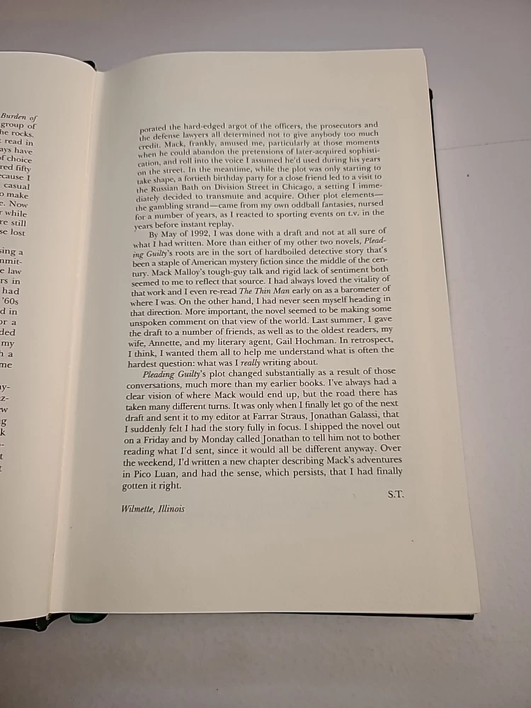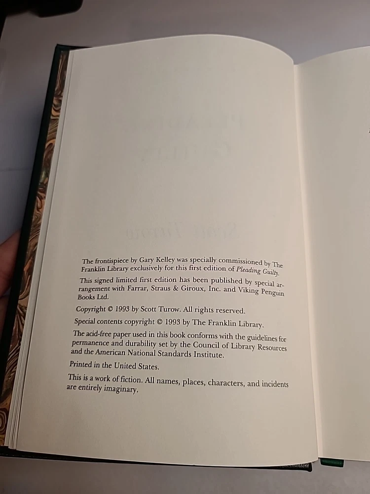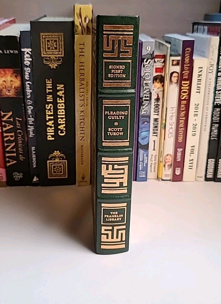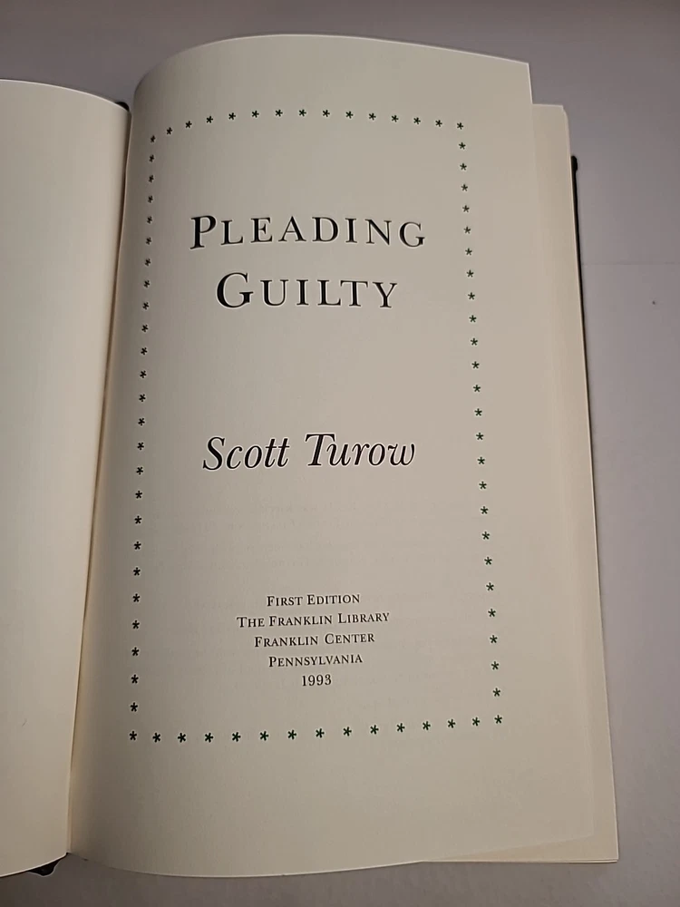 This product is a signed first edition of the novel "Pleading Guilty" by Scott Turow, published by Franklin Library in 1993. The book is bound in leather and is in English. It falls under the topic of literature and fiction, making it a valuable addition for collectors and fans of Turow's work. This rare and unique edition would be a prized possession for any avid reader or book enthusiast.
