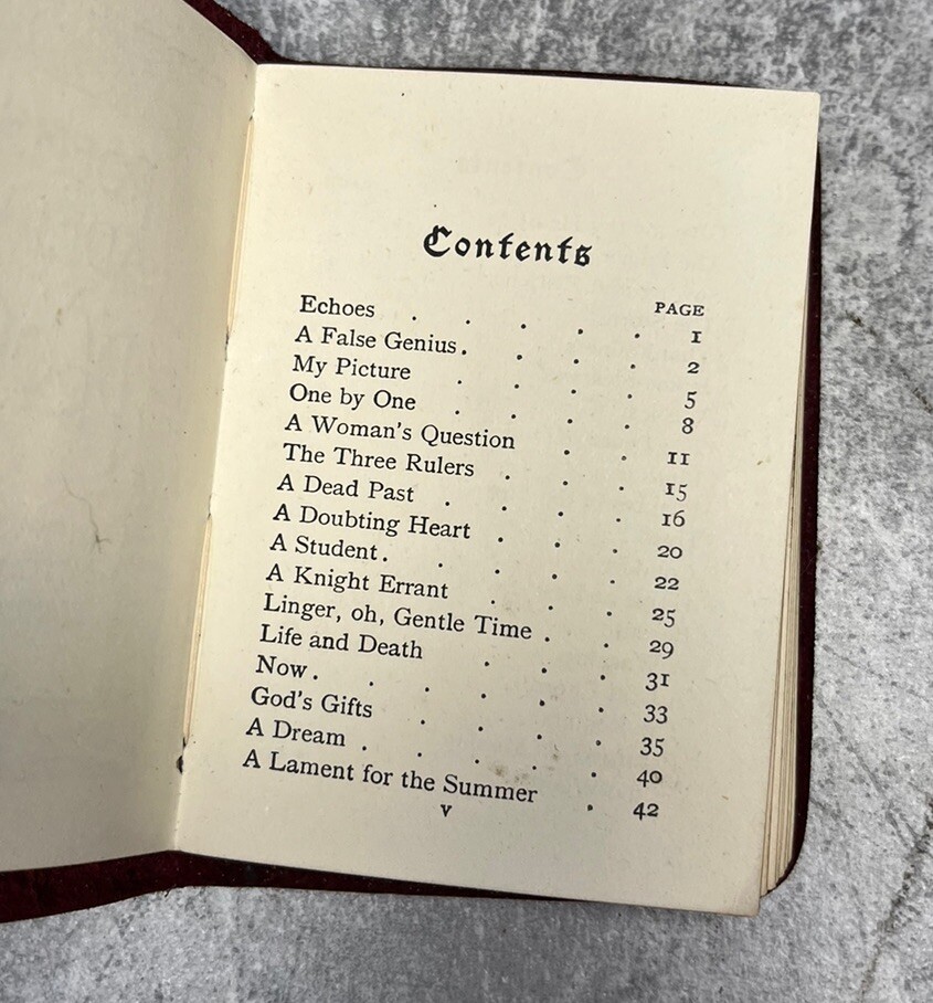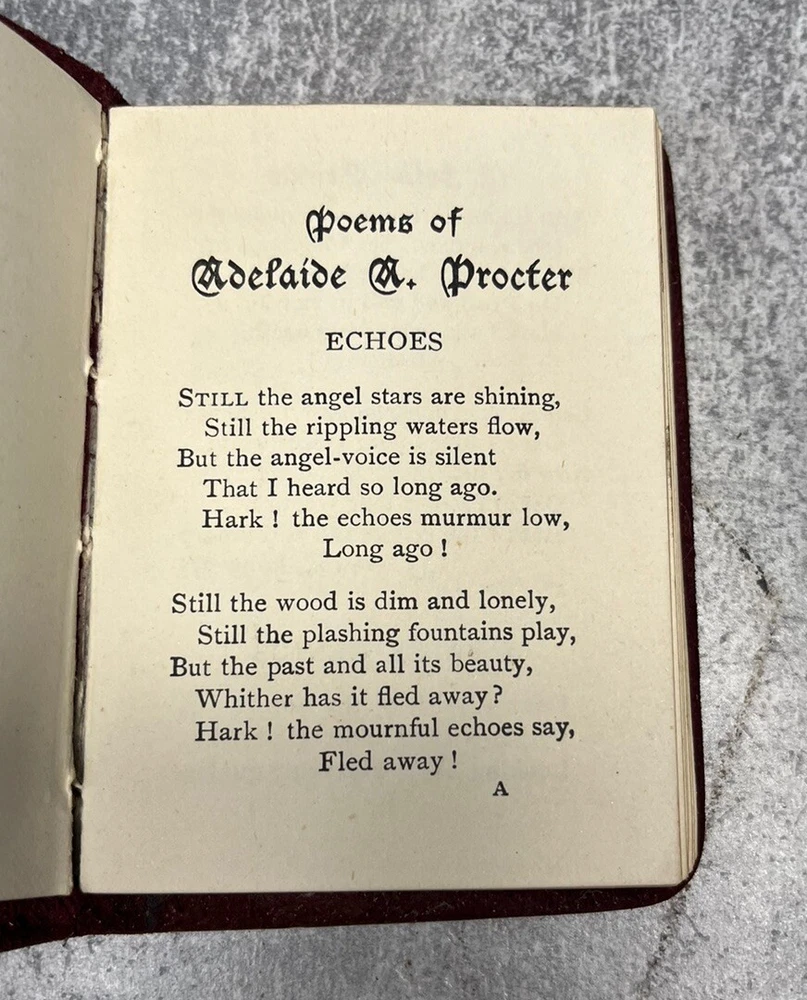 Poems Of Adelaide A. Procter - 1909 - Soft Red Leatherbound with Gold Gilt Edges and Lettering The Miniature Series - Nimmo, Hay & Mitchell - Edinburgh Published by : Nimmo, Hay & Mitchell - Edinburgh Dimensions : Height 9cms x Width 6cms x Depth 1.5cms Pages : 120 Condition : Pre-Owned, In our opinion the book has some slight pre-owned wear and tear nevertheless is in tact, and appears generally in very good condition, as shown. However we are not experts. IF YOU WOULD LIKE FURTHER SPECIFIC IMAGES OF THE ITEM, OR HAVE ANY QUESTIONS, PLEASE MESSAGE ITEM IS OFFERED AS SHOWN