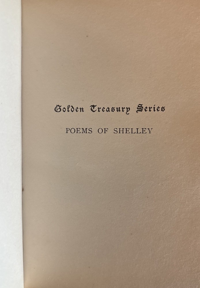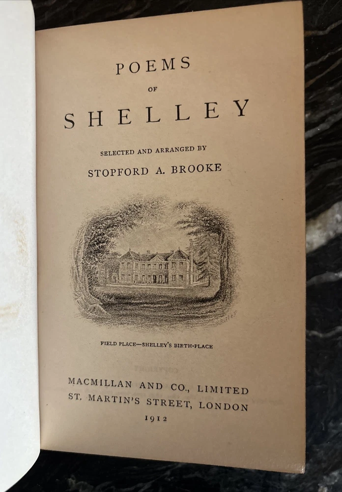 The product is a hardcover book titled "Poems of Shelley" from the Golden Treasury Series, published in 1912 by Macmillan and Co. This edition of the book is arranged by Stopford A Brooke and features leather binding. The book contains poetry by Shelley in English language, making it a valuable addition to any book collection or lover of poetry. Very rare edition. Please refer to pictures for exact condition. Sale benefits nonprofit