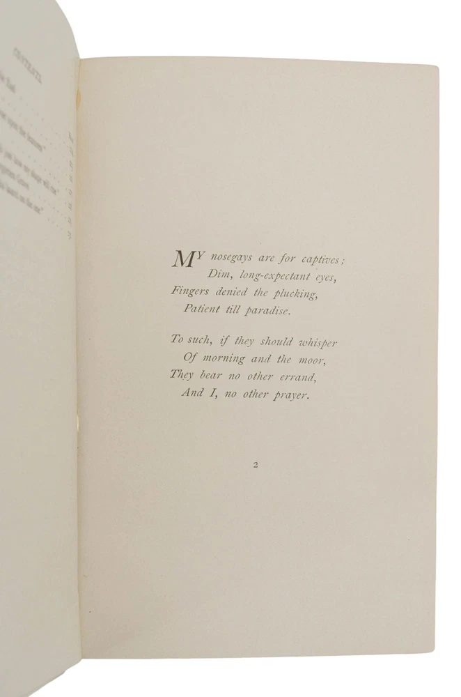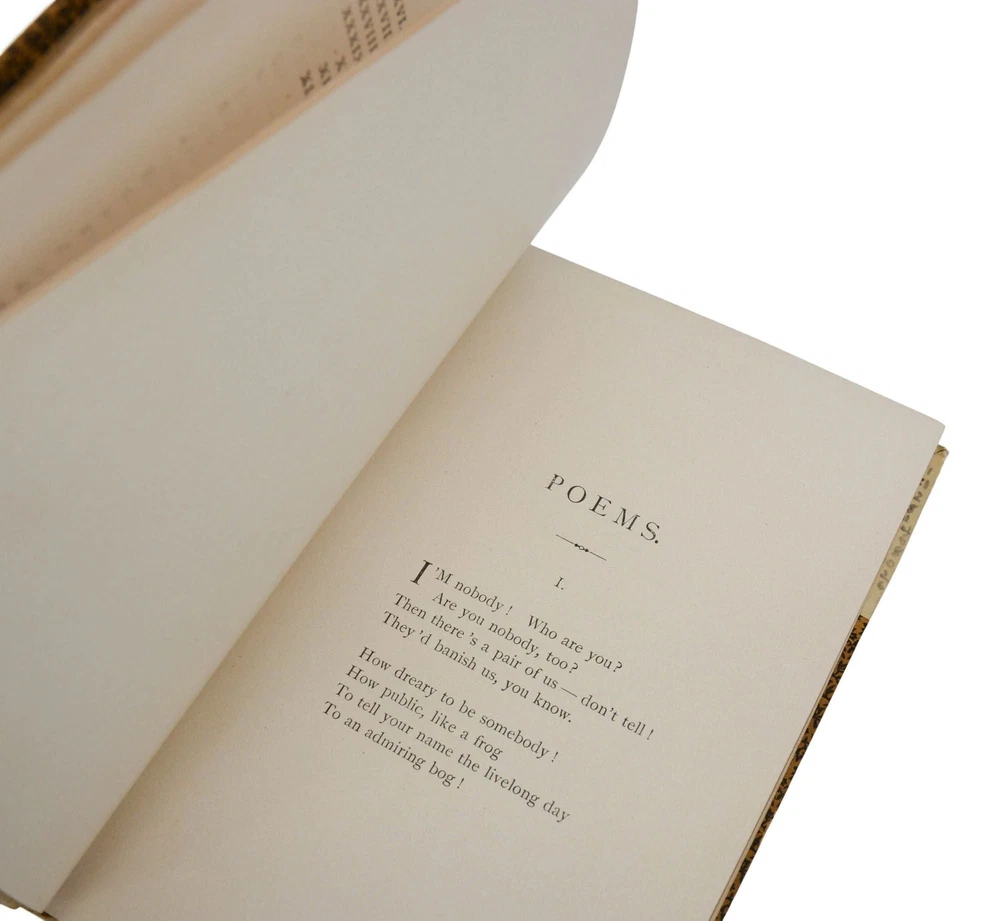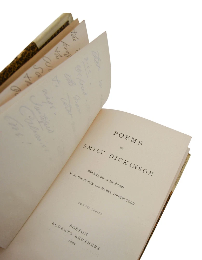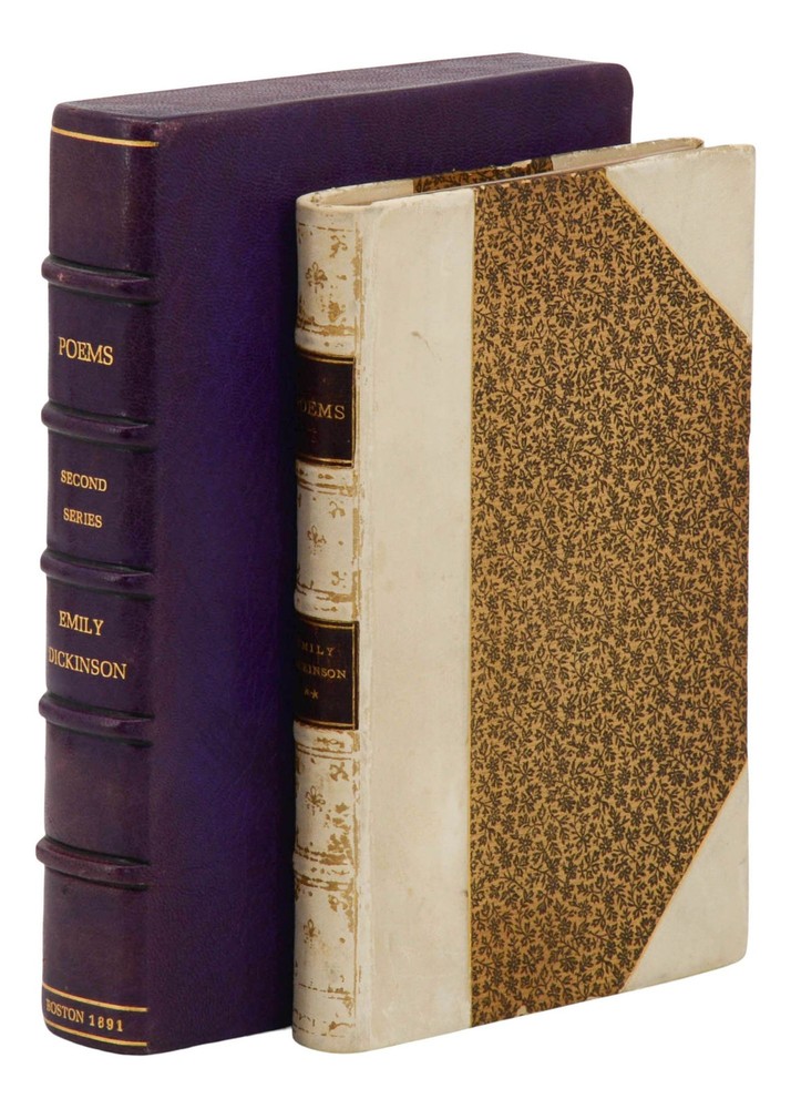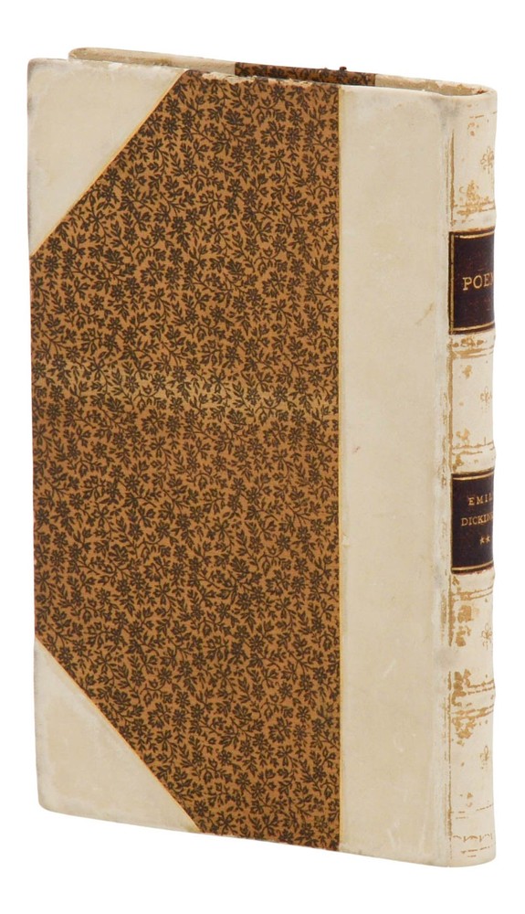Poems: Second Series by Emily Dickinson First edition in the scarce publisher's deluxe gift binding Boston: Roberts Brothers, 1891. First edition, first printing. Bound in the publisher's rare gift binding in half white goatskin and floral-patterned paper over boards, spine tooled in gilt at compartments with gilt-lettered and tooled morocco spine labels, all edges gilt. Originally printed on October 21, 1891 and issued in three binding styles. This is by far the scarcest variant for this title; the other two bindings were issued new at a price of $1.25 and $1.50, while this binding was originally issued at a pricey $3.50, the equivalent of $120 today. Near Fine with rubbing to spine with some loss to gilt decorations, light soiling and edge wear to boards, photographic postcard of Dickinson's home in Amherst, MA mounted on front pastedown. Front inner hinge slightly exposed, former ownership of Charlotte F. Roberts dated Christmas 1893, at front flyleaf; light pencil numerals written on rear leather turn-ins. Housed in a custom lavender colored morocco slip case lettered in gilt. An absolutely beautiful production of Dickinson's second volume of collected poetry with her most well-known poems, such as "I'm nobody! Who are you?" and "Wild nights! Wild nights!" The scarcest variant binding for this title. Myerson notes "copies in Binding C have also been bound with a gathering omitted or a leaf a1 cancelled. In all copies, leaf 15 4 has been cancelled. Myerson A2.1.a, BAL4656.
