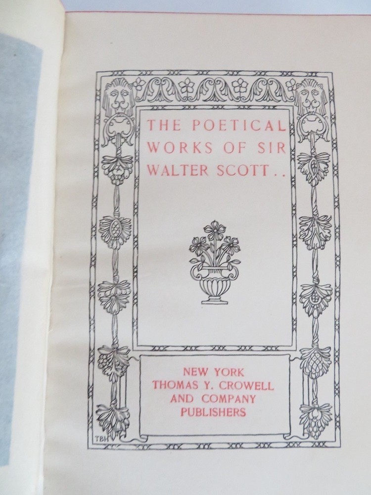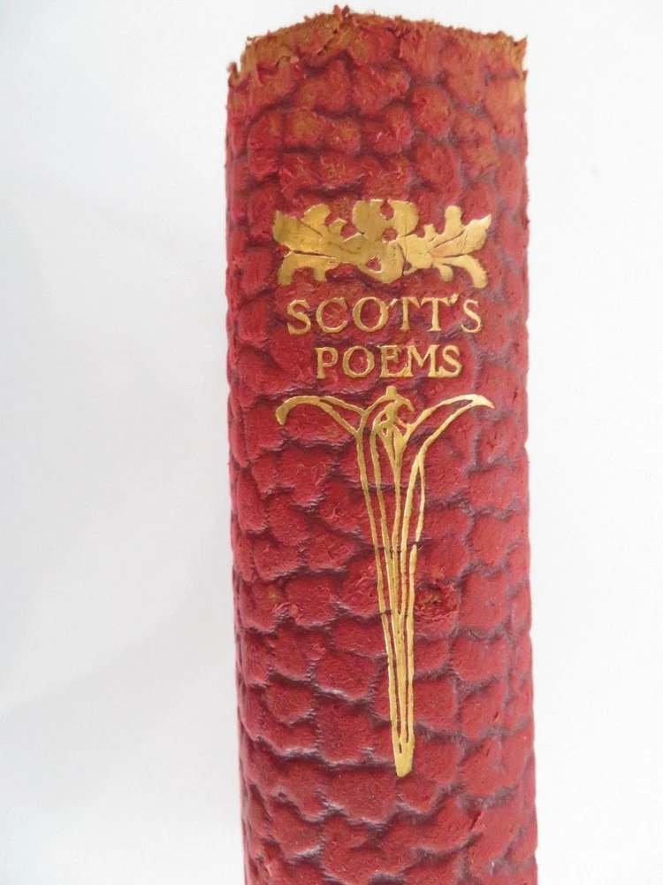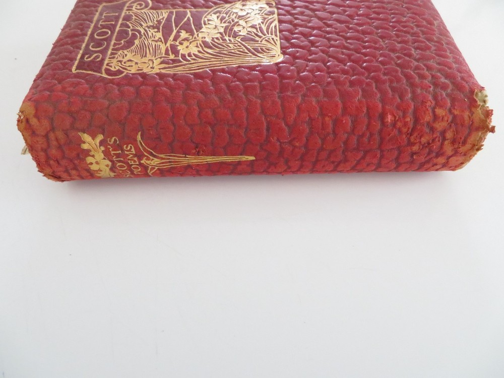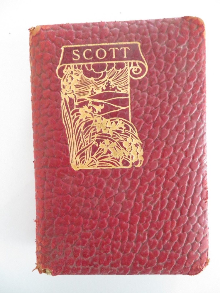 Poems of Sir Walter Scott 1894 edition. Leather bound looks like Alligator. Gold gilded pages edge. Picture of Sir Walter Scott in front. Measures 7.25 x 5. In addition a one page article was sitting on page 348 and is included. Not sure if it is related to this book or not. This is an 1894 edition and cover is worn, please see pictures. Tear on edge of back cover. Insurance will be included in shipping. Thank you for looking!