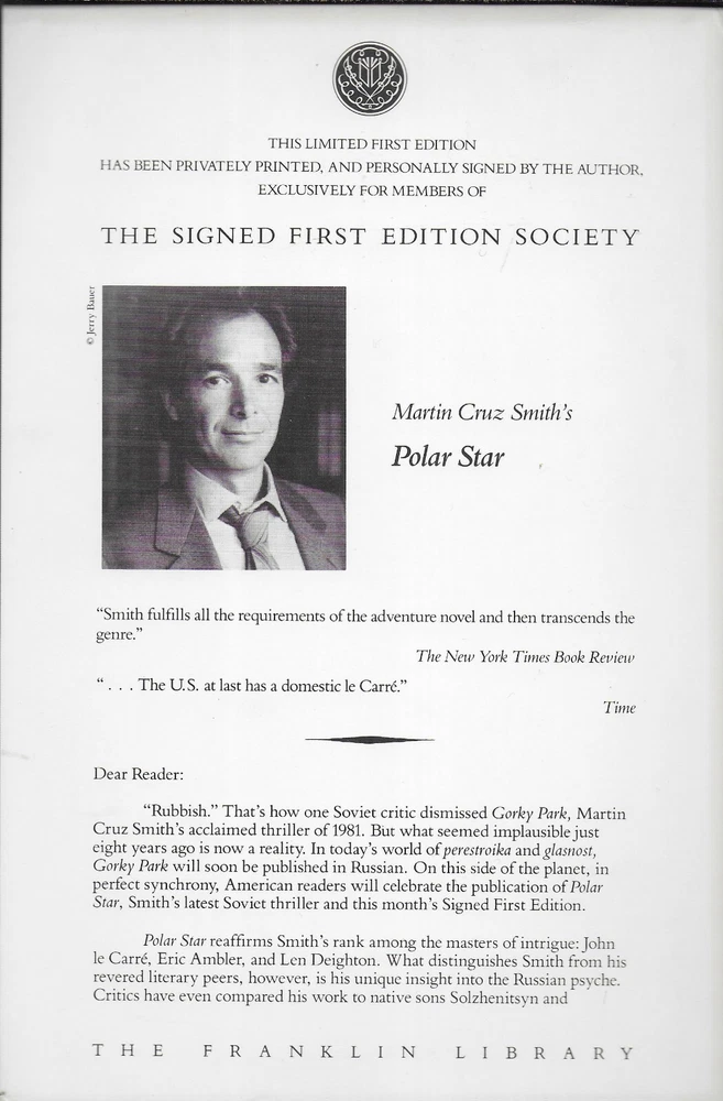 Polar Star by Martin Cruz Smith, Franklin Library, Signed Limited 1st Edition You are bidding on Polar Star by Martin Cruz Smith . The artwork is by Scott Reynolds . The Franklin Library, Franklin Center, PA published the book special contents copyright 1989. It is a limited first edition. Martin Cruz Smith signed the front flyleaf. The book is part of Franklin Library’s series Signed First Editions . The interior, beautiful color cover, and attached silk bookmark are in fine condition. The pages are tight and clean. There are no tears, marks, and bookplates. The page edges are richly gilded to seal out moisture. There are small dents on the outside edges. The cut paper edges had the dents prior to applying the gilding. There are no scratches. The book is 6 3/4” x 9 1/4” tall and 386 pages plus a 1 page colophon. In the front of the book, is The Signed First Edition Society information card. Combine Shipping Discount!!!!! Save money when you buy more than one item (lot) from us! Except in rare cases, s & h to a U. S. address via media mail in the same box is $1.35 for each additional book. eBay may automatically send a combine invoice with the wrong s & h. Please wait to pay until you receive my combine invoice with the correct s & h. PLEASE CHECK OUT MY eBAY STORE AND OTHER AUCTIONS!!! 102 9 2024102024