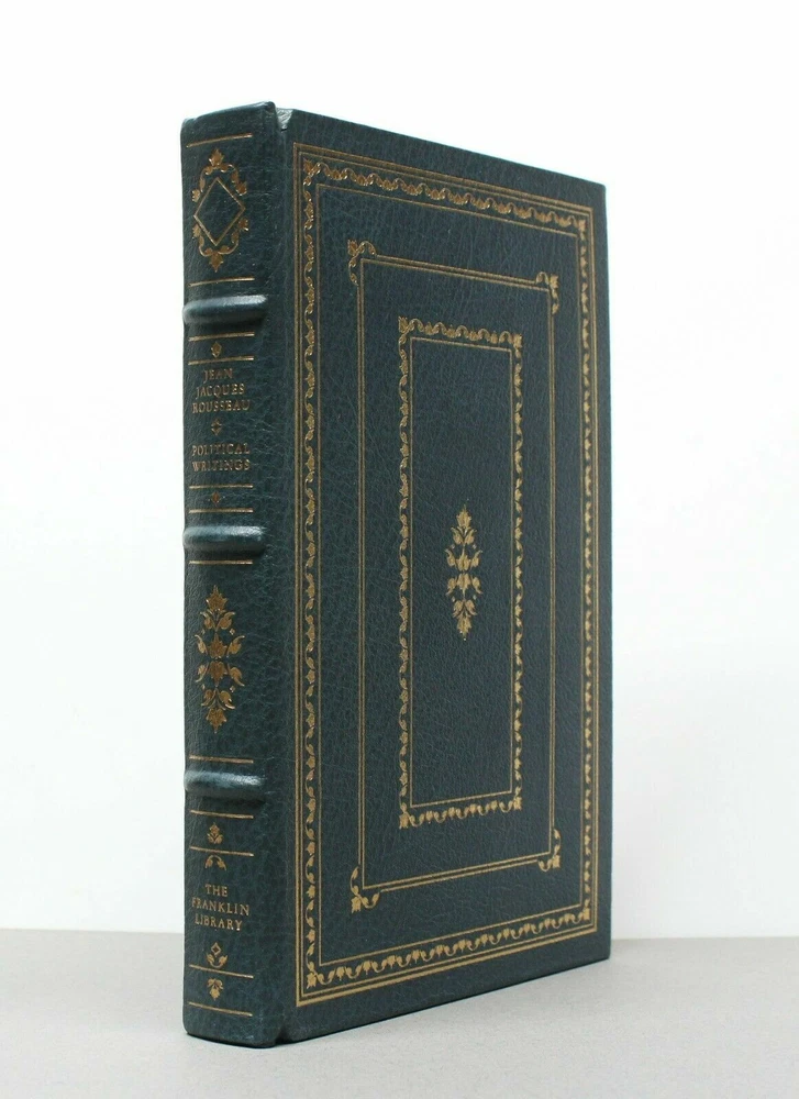 This is full genuine leather bound in new and sealed condition, never opened or read. The publisher’s notes booklet is inside the plastic wrap. The last photo is for exemplification only. This book is the perfect find, perhaps the last one to be found in plastic wrap. It laid in waiting for nearly 40 years to find its unique loving owner. 'Political Writings' by Jean Jacques Rousseau is one of Franklin Library's ‘100 Greatest Books of All Time’, with wonderful attributes: •Fully and tightly bound in genuine leather. •22kt gold accents deeply inlaid on the "hubbed" spine and covers. •Heavy duty binding boards enhance the book’s durability. •Superbly printed on acid-neutral paper that lasts for generations. •Sewn pages – not just glued like ordinary books. •Handsome moiré end pages and a satin-ribbon page marker. •Gold gilded page ends. •Rigorous inspection at every stage ensured adherence to exacting standards and the highest quality. •Superb craftsmanship and commitment to quality. The appeal for collecting Franklin Library comes from having these attributes taken way further into the exquisite quality, durability and craftmanship, than Easton Press and Folio Society managed with their productions. This book is the perfect companion out on a park bench with a hot cup of coffee or snuggled up in front of the fireplace. Despite its all-inclusive nature it still feels very light and compact at a size of 3.5 x 16 x 24cm. Wonderful to hold and excellent reading experience.