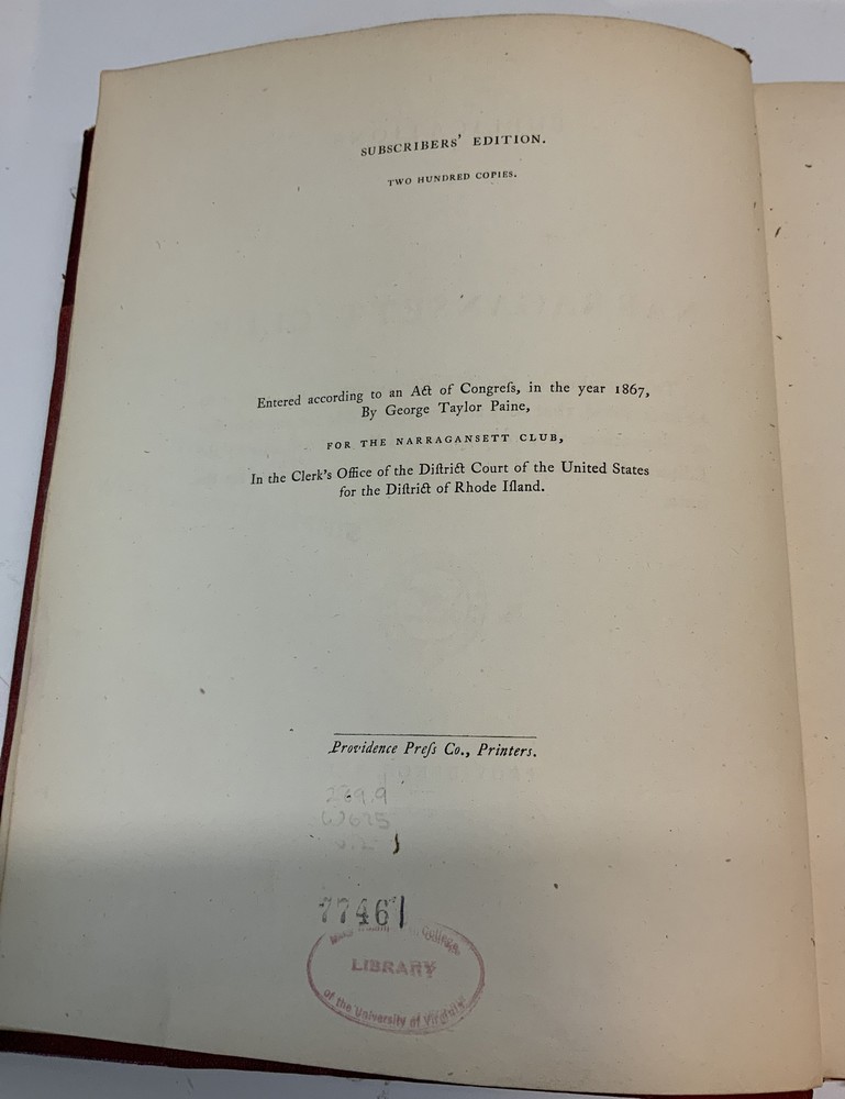 Publications Of The Narragansett Club Series First Series Volume 2 Original 1867. Not a reproduction this is an original copy one of 200 copies produced. Book came from University library has library markings. Please review all pictures