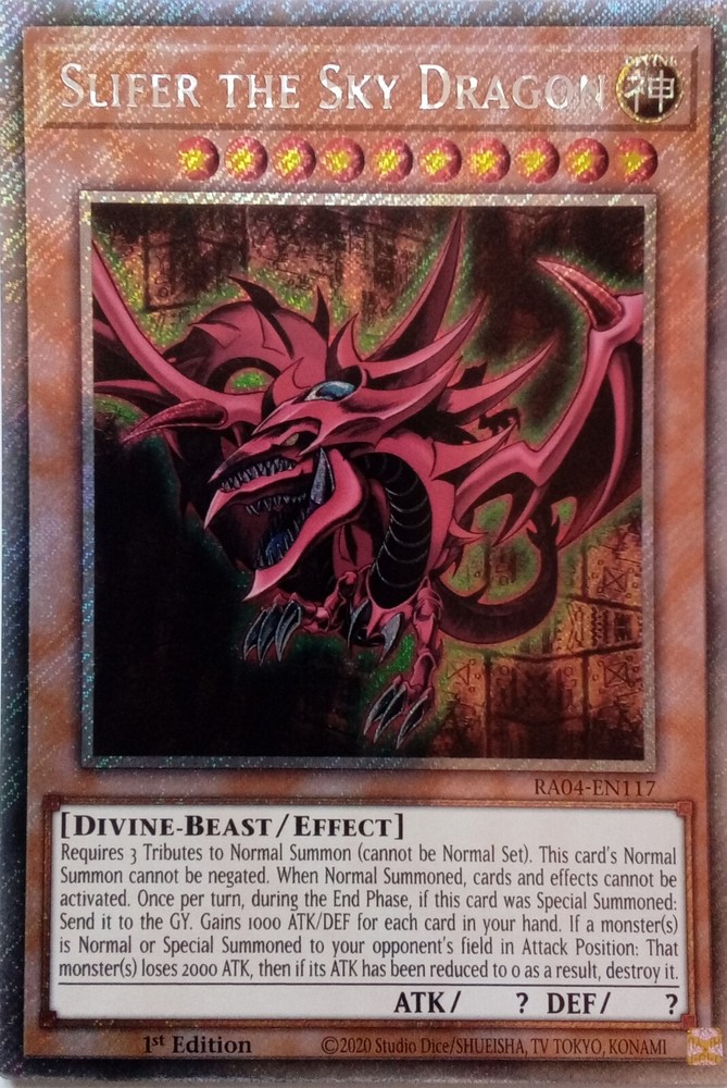 RA04-EN117 SLIFER THE SKY DRAGON PLATINUM SECRET RARE 1ST EDITION ALL YU-GI-OH CARDS I SELL ARE KONAMI TOURNAMENT LEGAL. CARDS ARE ALL BRAND NEW AND IN MINT CONDITION. POSTAGE IS FREE SO YOU CAN BUY AS MANY CARDS AS YOU WANT FROM US AND NOT PAY A PENNY POSTAGE. IF YOU HAVE ANY QUESTIONS PLEASE FEEL FREE TO CONTACT ME. Track Page Views With Auctiva's FREE Counter