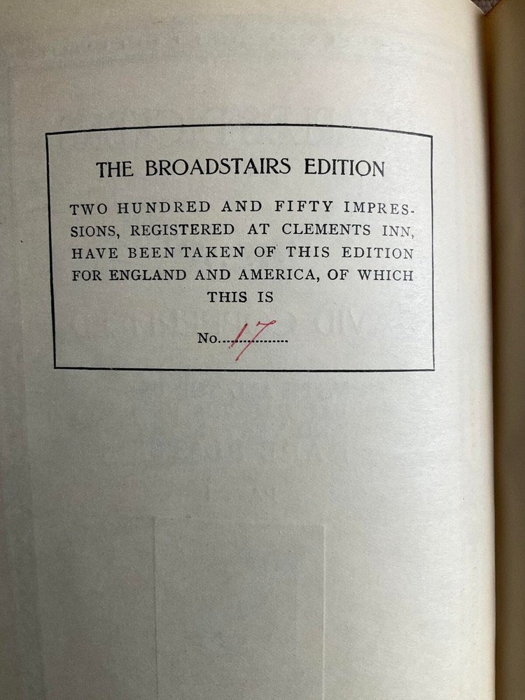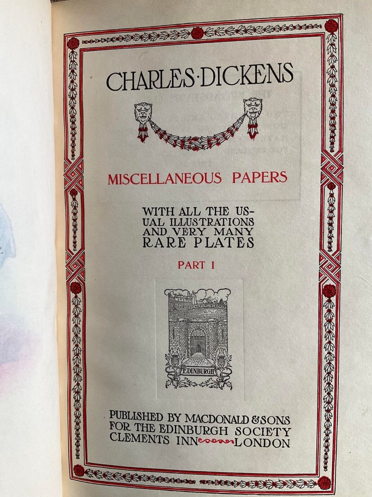 Attention Charles Dickens Collectors!!! You are bidding on a rare antique hardcover set of books titled Miscellaneous Papers. By one of the most famous and beloved authors, Charles Dickens. This two volume set is from a very scarce publishing by MacDonald & Sons For The Edinburgh Society, Clements Inn, London. There is no publishing date, but these books date from around 1900. This is a super scarce publishing. It is called The Broadstairs Edition. There were only 250 sets of these books made and this is from set number 17! An extremely desirable, very low number from this Limited Edition set!!! The books have full page illustrations by well-known artists. The illustrated pages are protected by captioned tissue guards. The illustrated frontispieces are in color and are outstanding! Books are three quarter leather-bound with leather tips. The spines have raised bands with gold lettering and gold designs. Covers are securely attached with no cracking or splitting of hinges/gutters. The spines have evenly sun-faded to a pleasant light brown color. All pages are very clean and tightly bound. Top edge of pages has gilt edge. Have decorative green endpages which are card stock. Books show some gentle wear and remain in very good condition. This is quite a rare publishing! This is a terrific title of a rare publishing that would be a wonderful addition to a collection. It's also a great gift idea! (Inventory: Box 19-B) Track Page Views With Auctiva's FREE Counter
