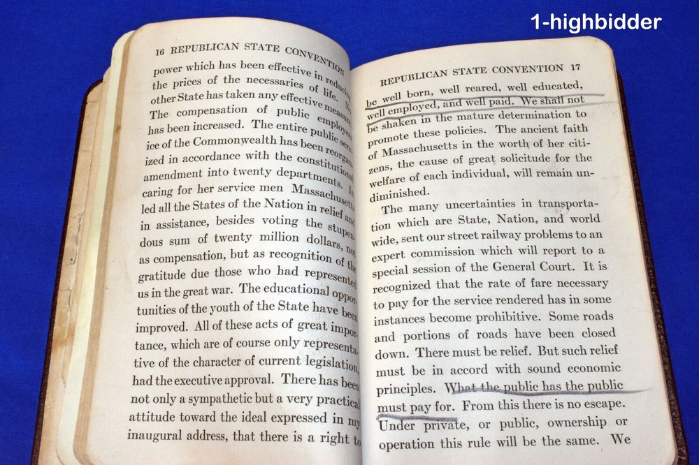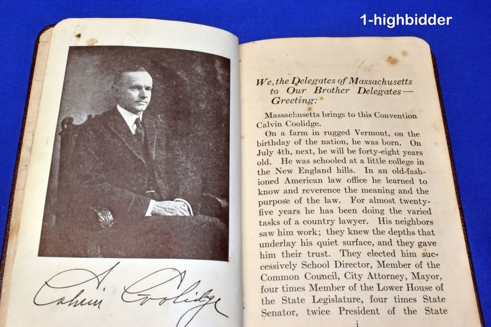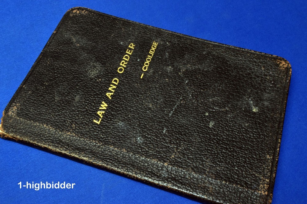 RARE 1920 Law and Order President Calvin Coolidge Leather Bound 1920 Election Year __________________________________________ Law and Order by Calvin Coolidge Published by *Donnelley (1920) *Donnelley is credited with publishing on google books although there is no indication on the book Condition: Very Good Softcover Book Bound in Leather! The book measures 4.25" x 6.375". The covers look excellent, as can be seen in my photos. The binding is tight and all 59 pages within are bright present with NO WRITING, HIGH-LIGHTING, RIPS, or TEARS, but there is some foxing; a medium amount of underlining in pen and pencil throughout the book; and some corner turn downs. The book is over 100-years-old, so don't expect perfection! But regardless, you will be happy with this one! Always handled and packaged with care! Buy with confidence from a seller who takes the time to show you the details and not use just stock photos. Please check out all my pictures and email with any questions! Thanks for looking! The book was written in the first part of 1920 and while there are no original copies available on the internet (till now) there are some print on demand copies. But even with these, there is no mention of the book in any of the internet biographies. This book is so rare that it is not even mentioned in the wikipedia article about the 1920 Election: At the 1920 Republican National Convention, most of the delegates were selected by state party caucuses, not primaries. As such, the field was divided among many local favorites. Coolidge was one such candidate, and while he placed as high as sixth in the voting, the powerful party bosses running the convention, primarily the party's U.S. Senators, never considered him seriously. After ten ballots, the bosses and then the delegates settled on Senator Warren G. Harding of Ohio as their nominee for president. When the time came to select a vice presidential nominee, the bosses also made and announced their decision on whom they wanted – Sen. Irvine Lenroot of Wisconsin – and then prematurely departed after his name was put forth, relying on the rank and file to confirm their decision. A delegate from Oregon, Wallace McCamant, having read Have Faith in Massachusetts, proposed Coolidge for vice president instead. The suggestion caught on quickly with the masses starving for an act of independence from the absent bosses, and Coolidge was unexpectedly nominated. The Democrats nominated another Ohioan, James M. Cox, for president and the Assistant Secretary of the Navy, Franklin D. Roosevelt, for vice president. The question of the United States joining the League of Nations was a major issue in the campaign, as was the unfinished legacy of Progressivism. Harding ran a "front-porch" campaign from his home in Marion, Ohio, but Coolidge took to the campaign trail in the Upper South, New York, and New England – his audiences carefully limited to those familiar with Coolidge and those placing a premium upon concise and short speeches. On November 2, 1920, Harding and Coolidge were victorious in a landslide, winning more than 60 percent of the popular vote, including every state outside the South. They also won in Tennessee, the first time a Republican ticket had won a Southern state since Reconstruction. Copyright © 2018-2024 TDM Inc. The photos and text in this listing are copyrighted. I spend lots of time writing up my descriptions and despise it when un-original losers cut and paste my descriptions in as their own. It is against ebay policy and if you are caught, you will be reported to ebay and could be sued for copyright infringement and damages.