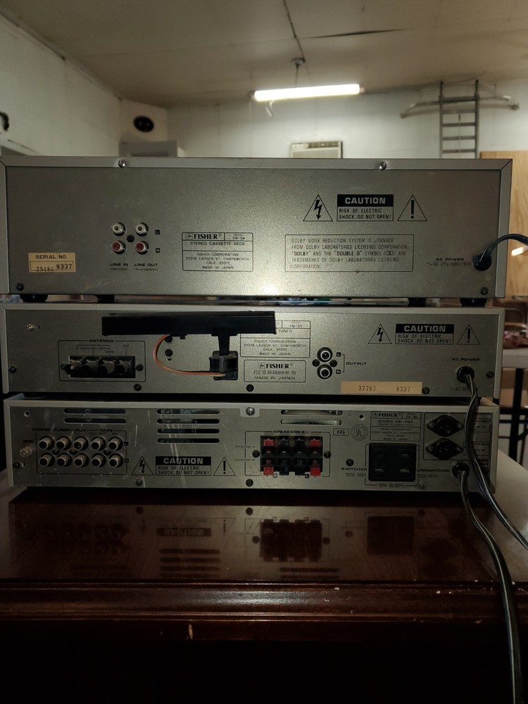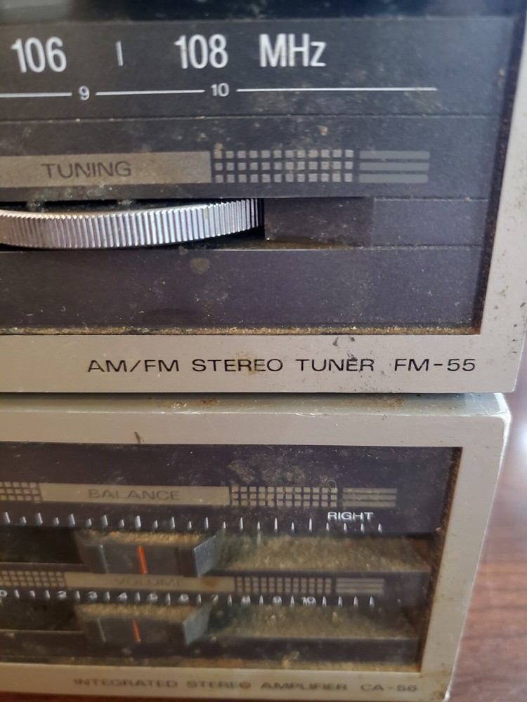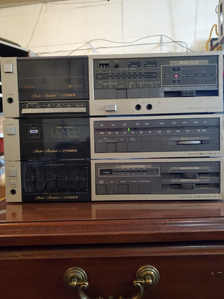 This vintage audio set from Fisher is a rare find for any audiophile. It includes a FM-55 equalizer/tuner, CA-55 amplifier, and CR-54 tape deck. The brand is known for its high-quality sound systems, and this set is no exception. This set powers on, but has not been tested.