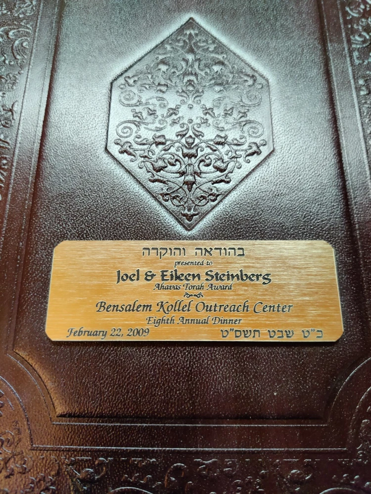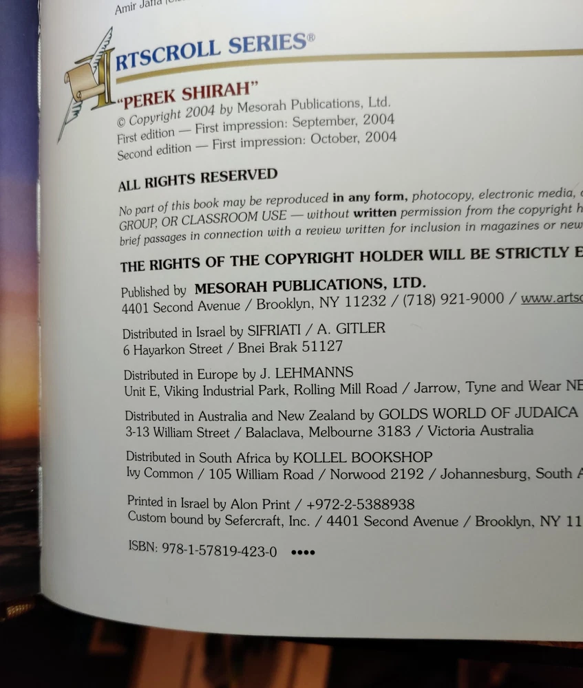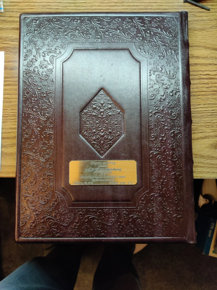 Own a piece of history with this unique copy of "Perek Shirah" from the renowned ARTScroll Series®. This book is not only a beautiful edition of a classic Jewish text but also a one-of-a-kind collector's item due to its special features: Personalized Inscription: The inside cover features a heartfelt dedication "In Honor of Jerry and Libbie Muller" acknowledging their generous support to the Bensalem Outreach Center. Commemorative Plaque: Affixed to the front cover is a personalized plaque presented to "Joel & Eileen Steinberg" with the "Ahavas Torah Award" from the Bensalem Kollel Outreach Center, dated February 22, 2009. This plaque adds historical significance and makes this copy truly unique. About the Book: "Perek Shirah" is a cherished Jewish text that presents verses from the Bible alongside interpretations from the Midrash and the Zohar. This ARTScroll edition offers a clear translation and insightful commentary, making this profound work accessible to all. Key Features: ARTScroll Series: Known for its high-quality production and scholarship. Hebrew and English Text: Presents the original Hebrew text alongside a clear English translation. Insightful Commentary: Provides deeper understanding and context for the text. Hard Cover: Durable and long-lasting. Excellent Condition: Well-maintained with minimal wear and tear. Perfect for: Collectors of Judaica Those interested in Jewish mysticism and spirituality Anyone seeking a deeper understanding of the Bible Gift for a special occasion Don't miss out on this opportunity to own this unique and meaningful piece of Jewish literature! Perek Shirah, ARTScroll Series, Judaica, Jewish book, Hebrew, English, Bible, Midrash, Zohar, collector's item, rare book, personalized inscription, commemorative plaque, Bensalem Outreach Center, Joel & Eileen Steinberg, Jerry and Libbie Muller, Ahavas Torah Award.