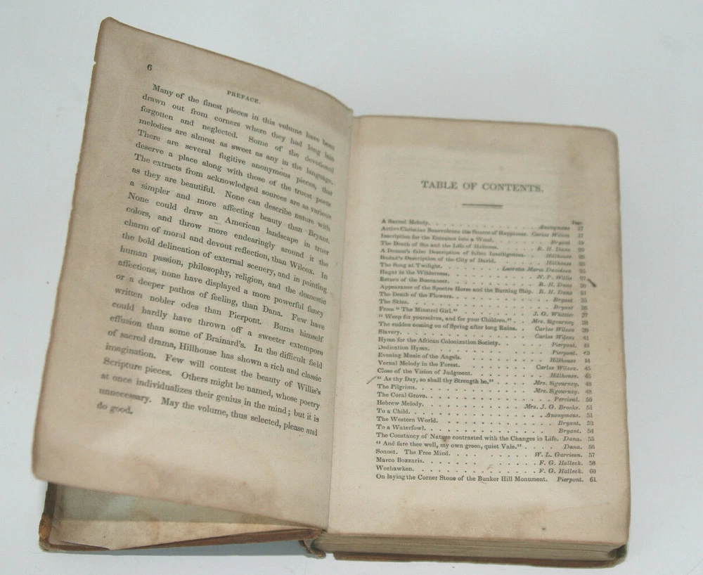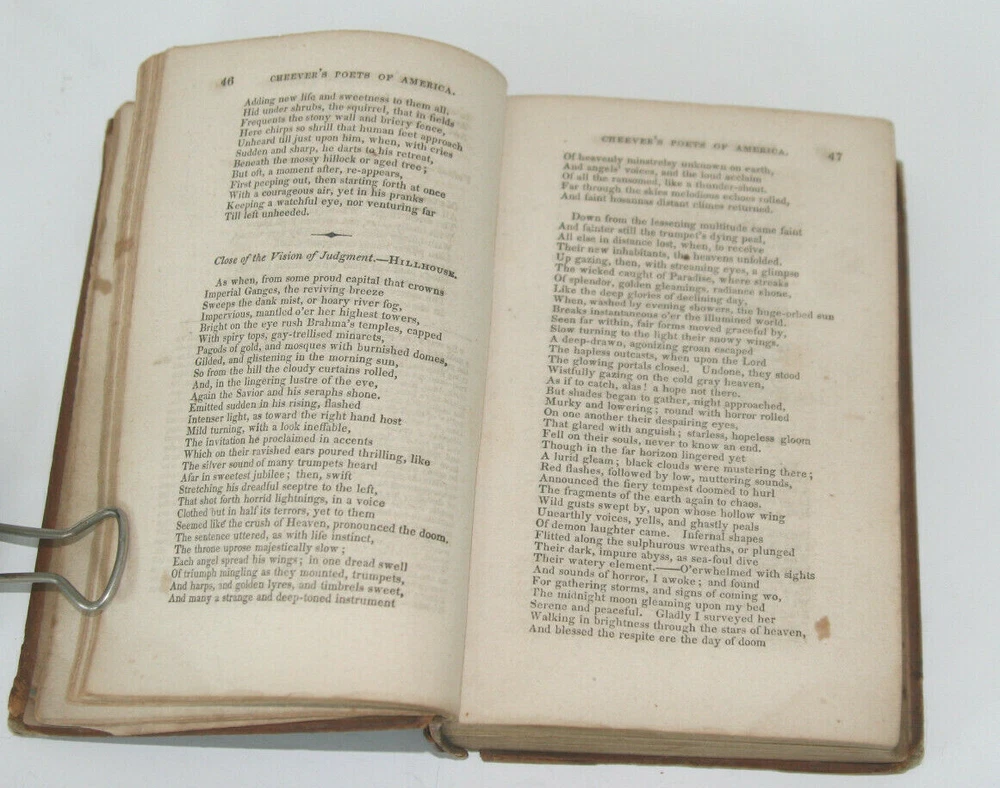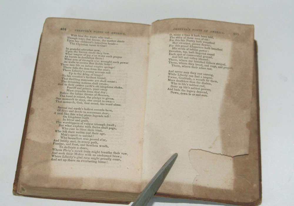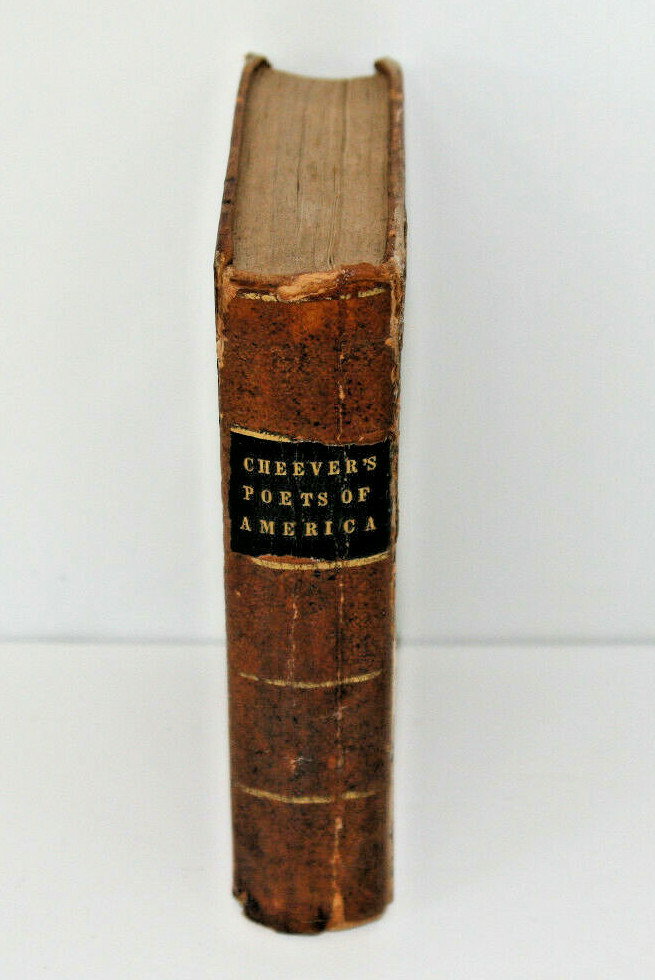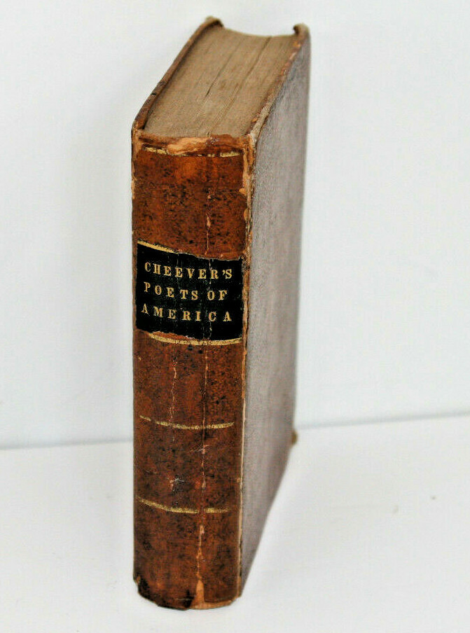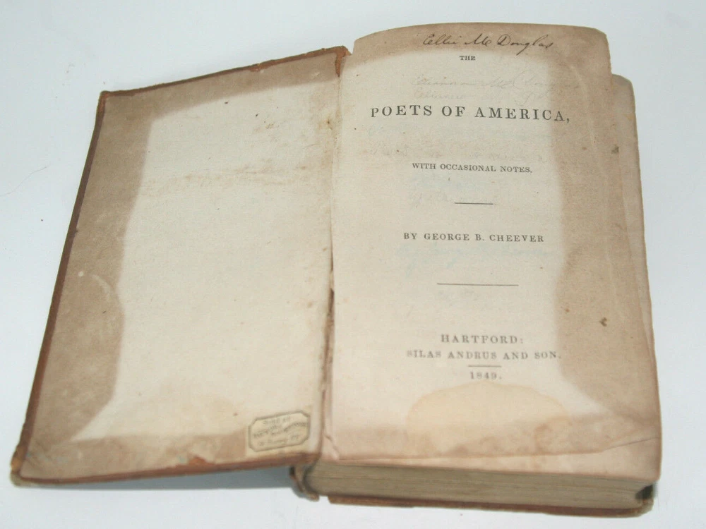 Poets of America with occasional notes", by George B. Cheever. Fine Solid Leather bound Antique Book! Published in 1849, Hartford, Ct. by Silas Andrus $ Son. Inside cover has sticker: "Sold at Raynor's Bookstore 76 Bowery, N.Y. also inside has written in ink: Ellie M. Douglas (I think, if I read her fine handwriting correctly) 405 pages, size: 6 1/4 inches long, 4 1/2 inches wide and 1 1/2 inches thick Good antique condition over all, last page is partially torn, please review photos.