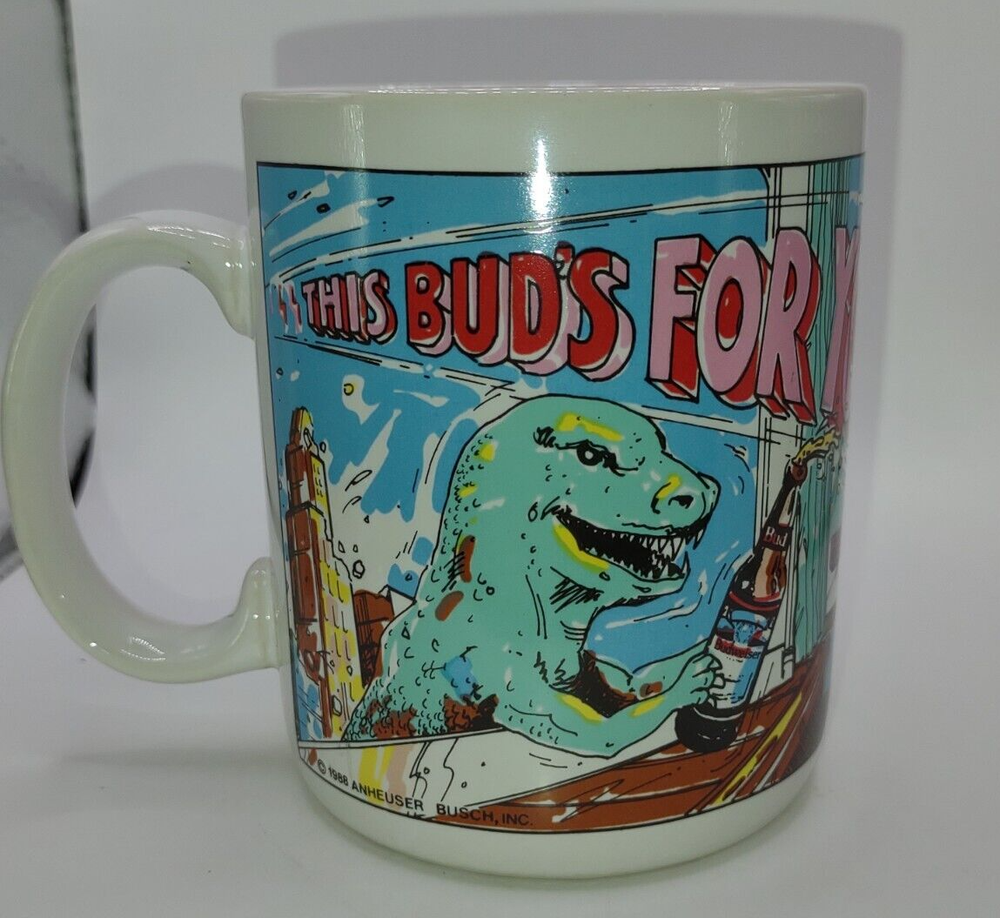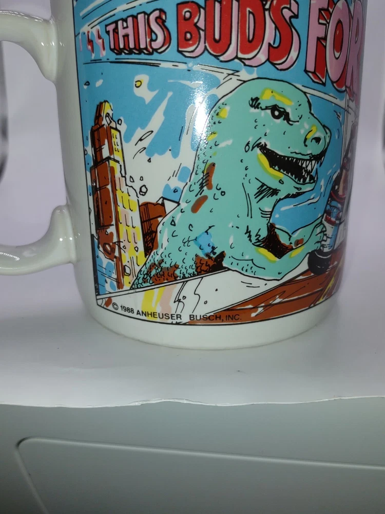 Add this unique Budweiser Godzilla 3D coffee mug to your collection! Made in 1988, this rare item features the iconic monster holding a frosty bottle of Bud's for you. Perfect for any Breweriana enthusiast or fan of the classic creature feature, this mug is sure to be a conversation starter. Don't miss out on this limited edition piece of Budweiser history. #123B
