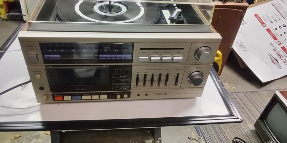 fisher mc-720 in tested condition, powers on, everything powers up, but sold as parts repair. Record player is slow, tape player is slow , radio functions, equalizer works. Needs oil and adjustment and will work again. Sold as is parts repair no warranty or refunds.