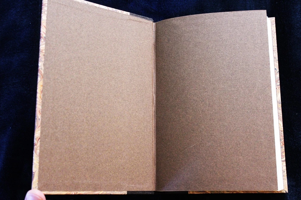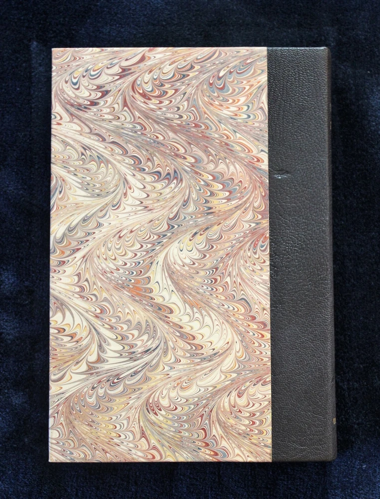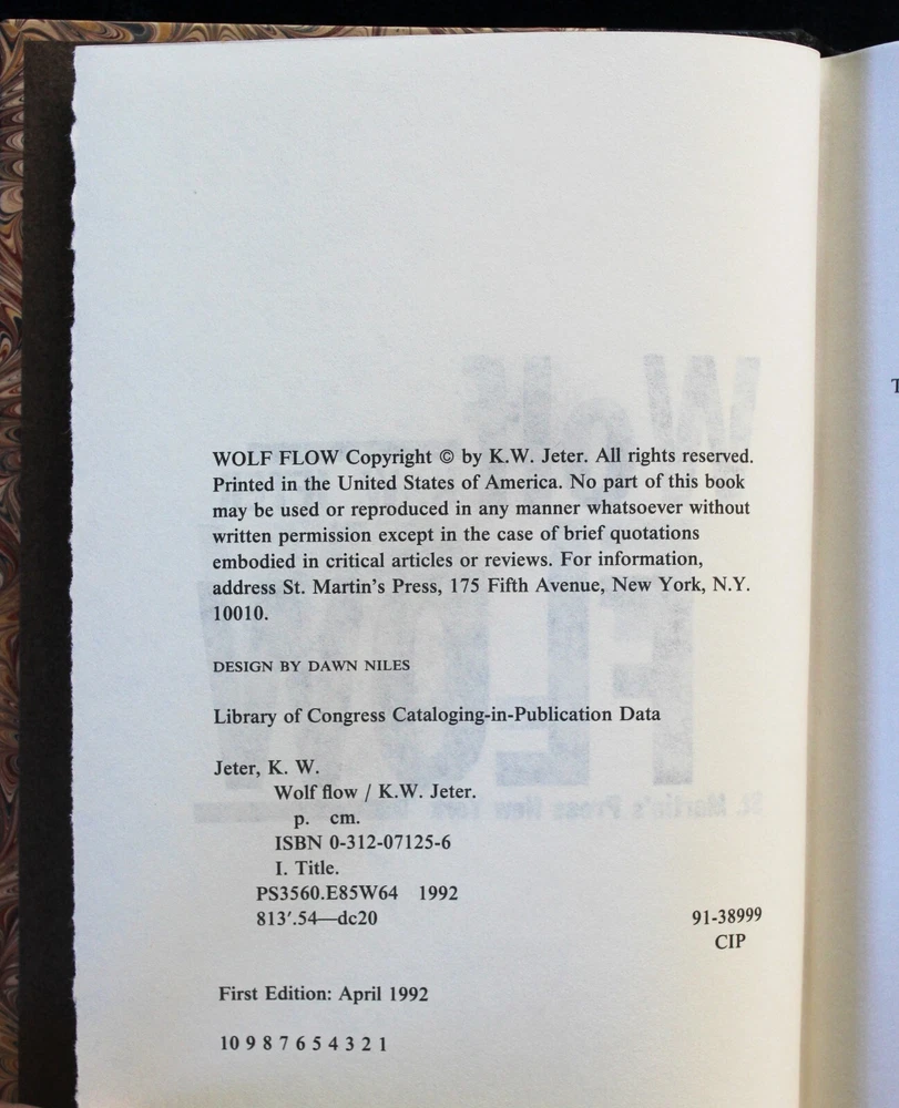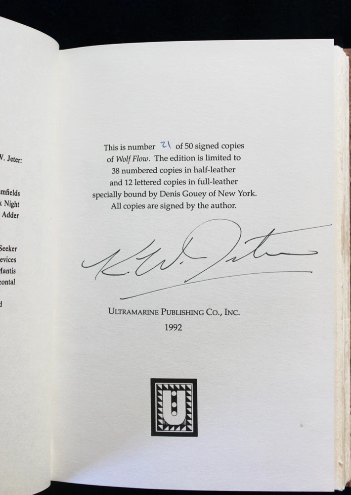 New, unread copy of the RARE half-leatherbound edition of Wolf Flow by K.W. Jeter, published by Ultramarine Press in 1992. Signed by KW Jeter, number 21 of 38 (there were 38 half-leather and 12 full-leather in the print run). Marbling and leather binding done by Denis Gouey of New York. There is a small, 1/8" by maybe 1/4" dent on the back board in the leather--see photo. Was like that when I got it. Purchased in 1992 and has sat on my shelf ever since. Smoke-free environment.